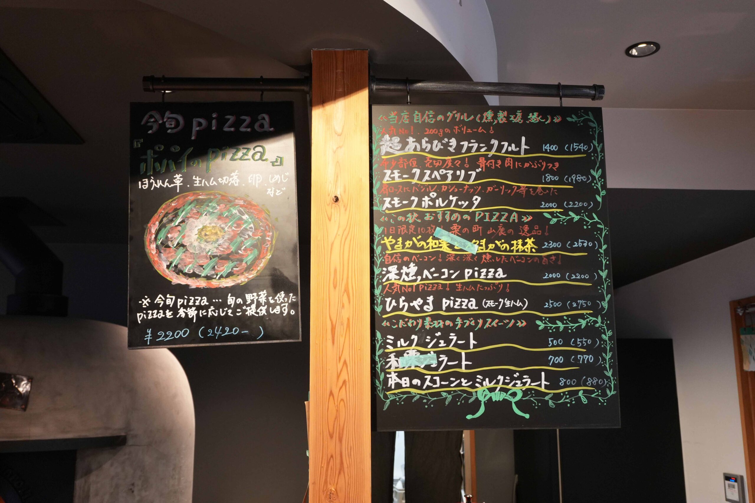 窯近くに吊り下げられている黒板には、「今旬pizza」として旬の野菜を使ったピザや、「当店自信のグリル(燻製工房 縁)」「この秋おすすめのPIZZA」「こだわり素材の手づくりスイーツ」などがチェックできるので、訪れた際にはぜひ確認してみてくださいね。