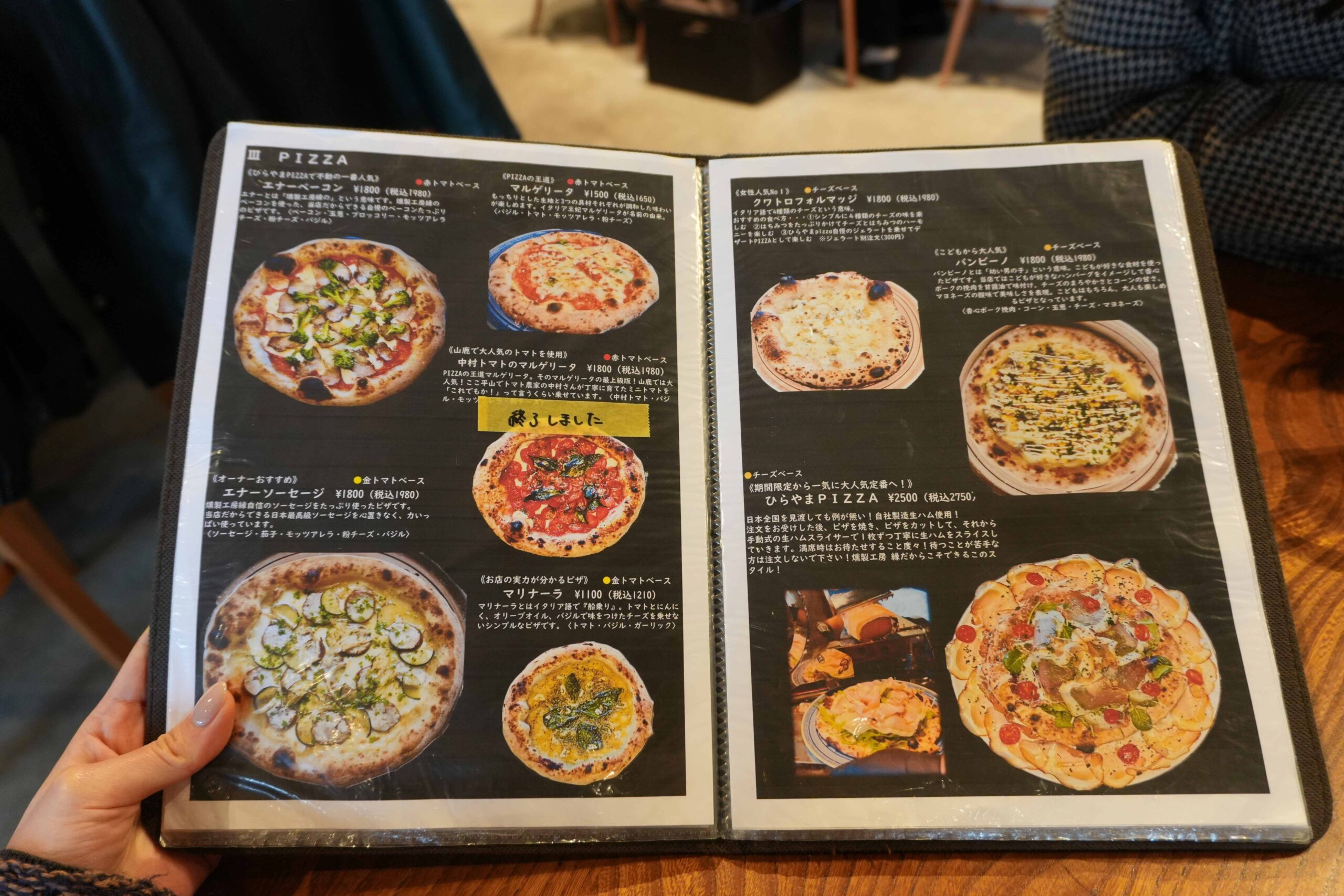 チーズベースには「クワトロフォルマッジ」「バンビーノ」「ひらやまPIZZA」のほか、平日10枚、土日20枚限定で季節のPIZZA「ビスマルク」も用意されていました。