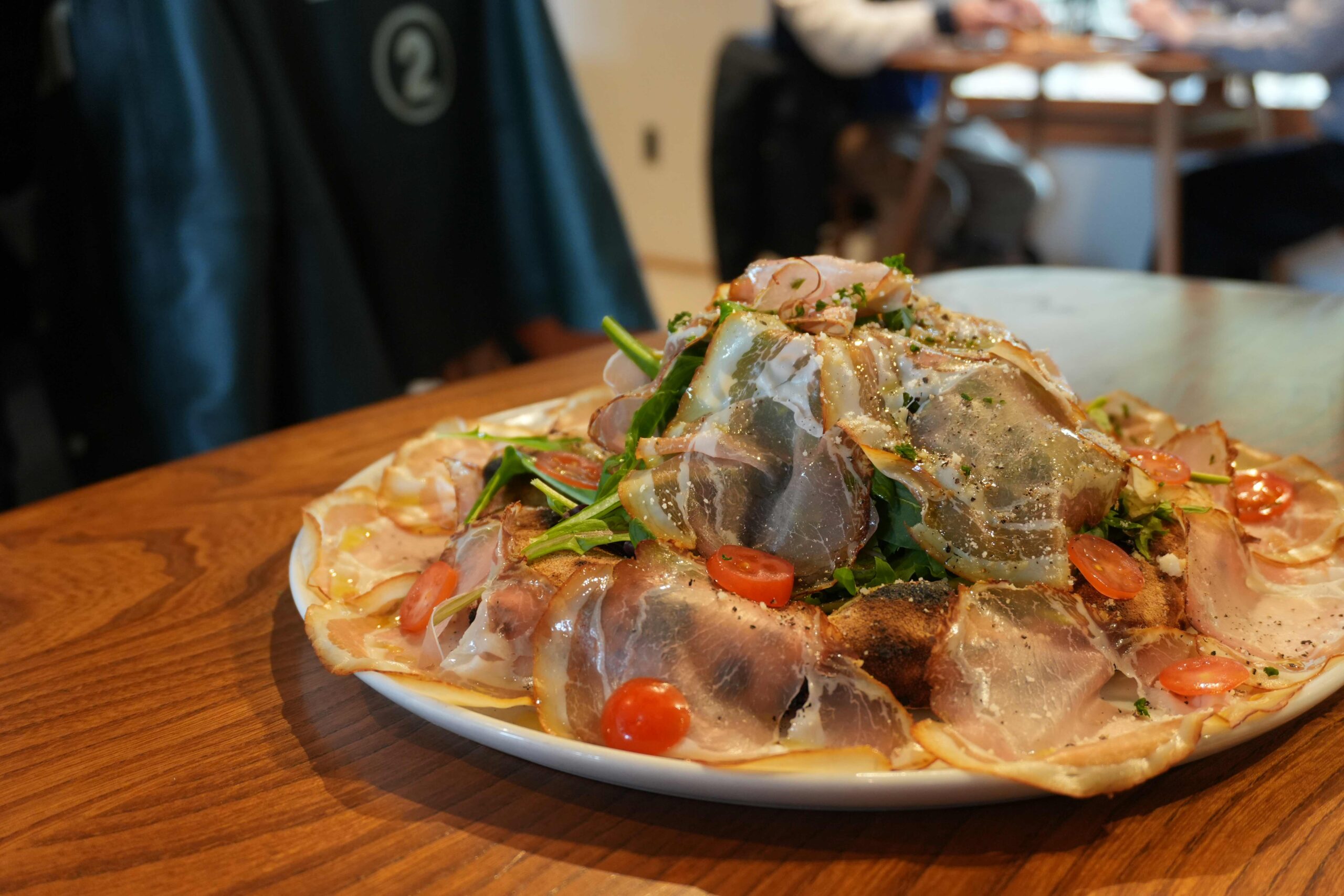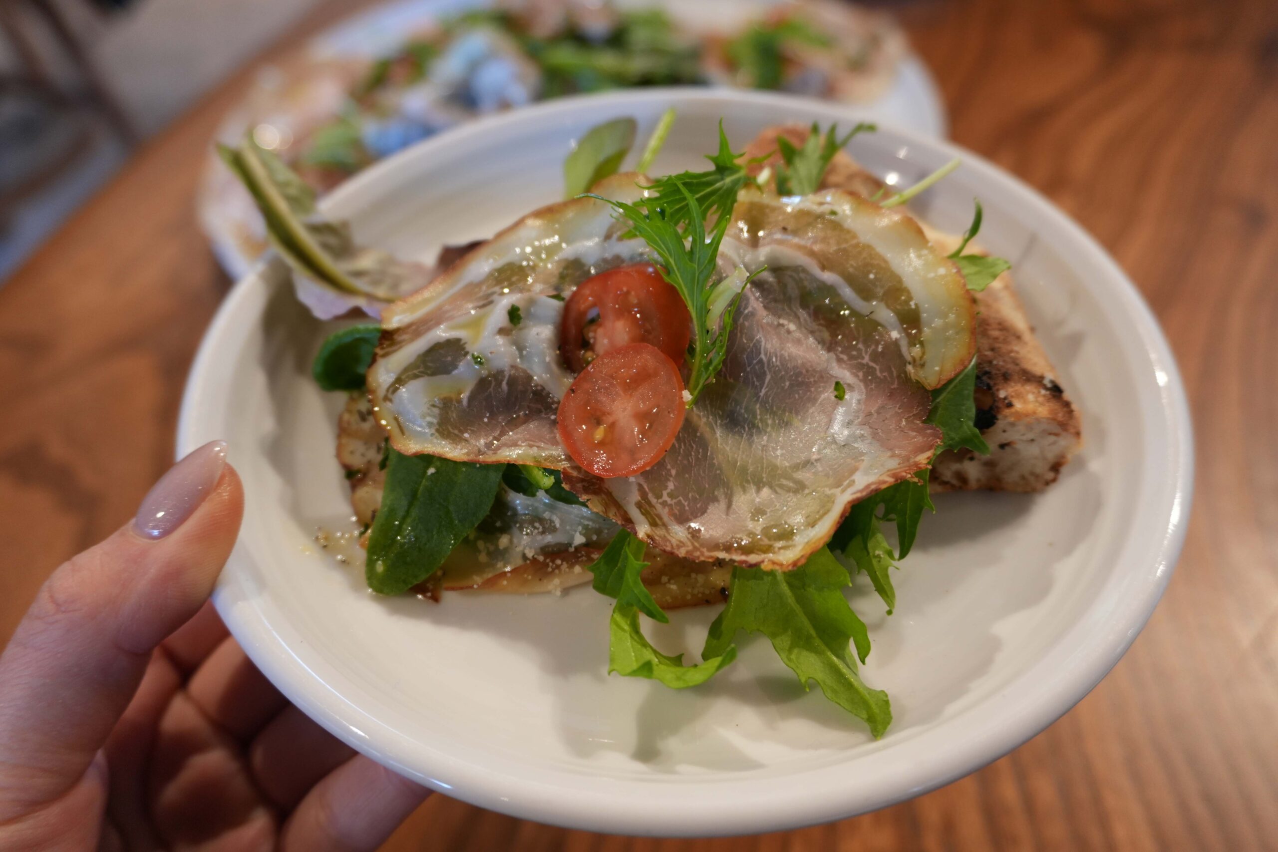 注文を受けてからピザを焼き、カットした後、手動式の生ハムスライサーで1枚ずつ丁寧に生ハムをスライスしていきます。この手間暇かけた工程のため、満席時には少し待つこともありますが、それだけの価値がある逸品です!