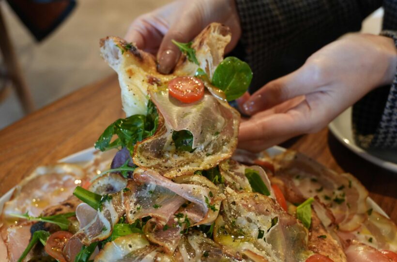 注文を受けてからピザを焼き、カットした後、手動式の生ハムスライサーで1枚ずつ丁寧に生ハムをスライスしていきます。この手間暇かけた工程のため、満席時には少し待つこともありますが、それだけの価値がある逸品です!