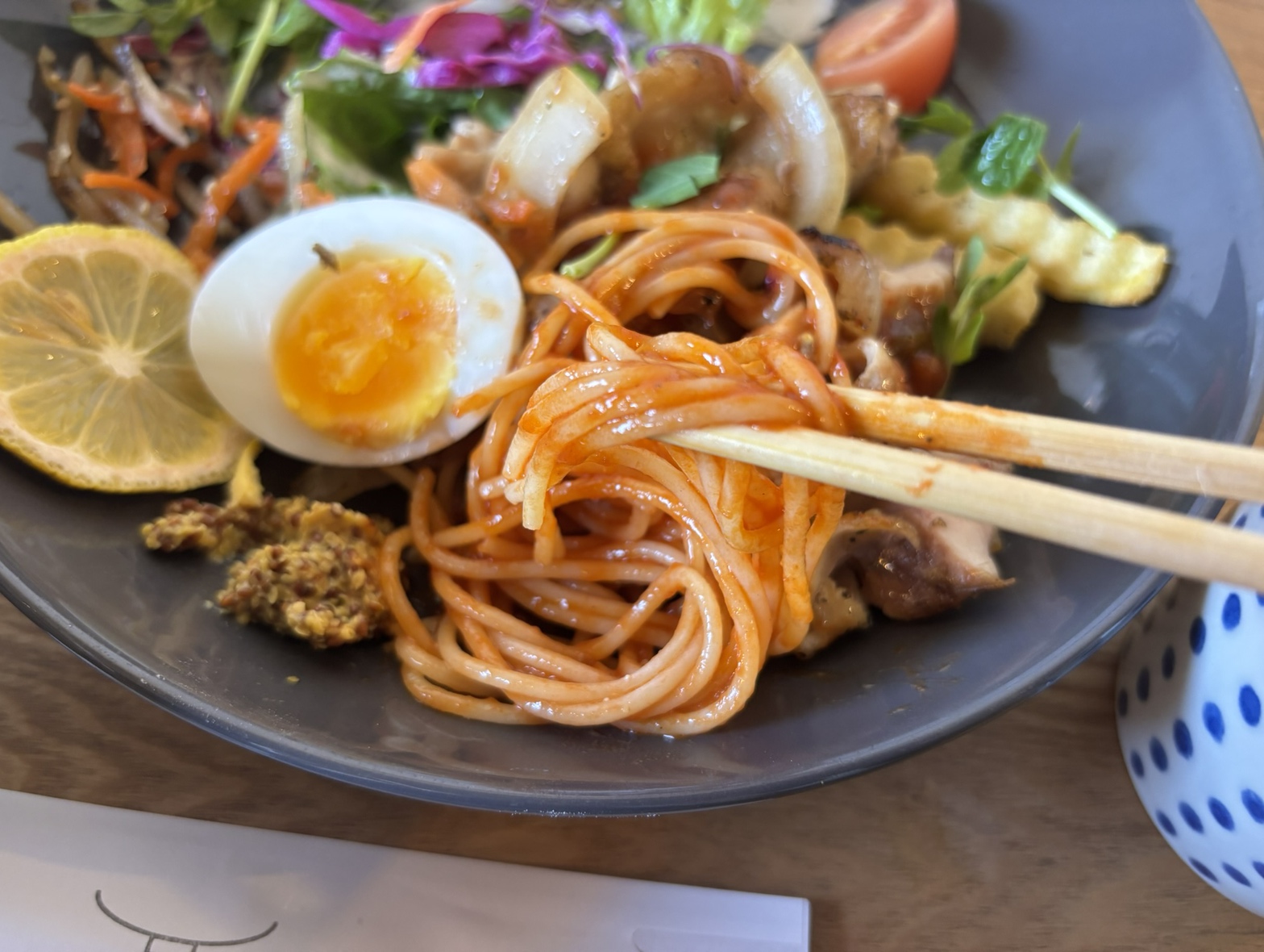 そして驚いたのが、メインの下にはパスタも隠れているんです!