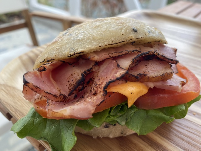 見た目のボリュームも満点!豪快に頬張ると、香ばしく炙られたベーコンの旨みが口の中でダイレクトに伝わります。柚子胡椒マヨのピリっとした辛さが相性抜群。