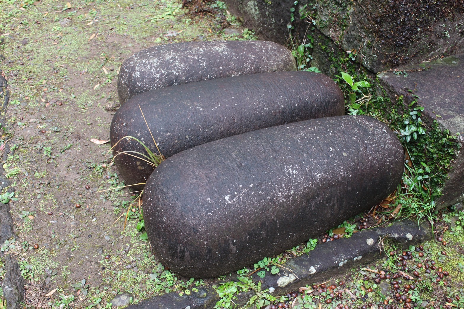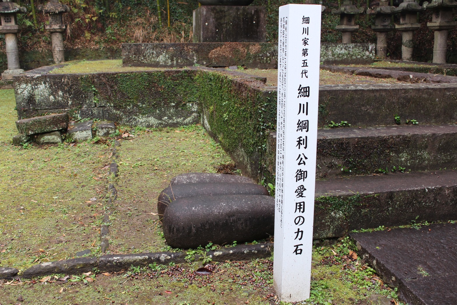 綱利公の墓のそばに置かれた、大きな石。一見すると自然石のようですが、これは綱利公が日々の鍛錬に用いていたと伝えられるものです。