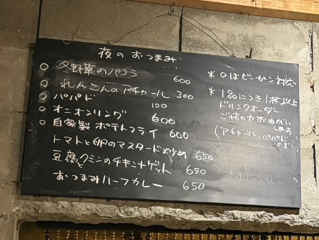 おつまみも「自家製ポテトフライ」「豆腐クミンのチキンナゲット」「おつまみハーフカレー」など、お酒と一緒に味わいたくなる一品ばかり。夜の利用にもぴったりです。