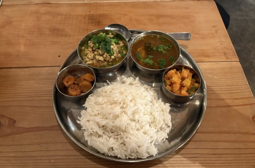 カレー×菜の花というこちらも珍しい組み合わせ。中にはダル(豆)が入っていて、味も食感も楽しめます。優しいのに味に深みがあり春らしさも感じる一皿でした。