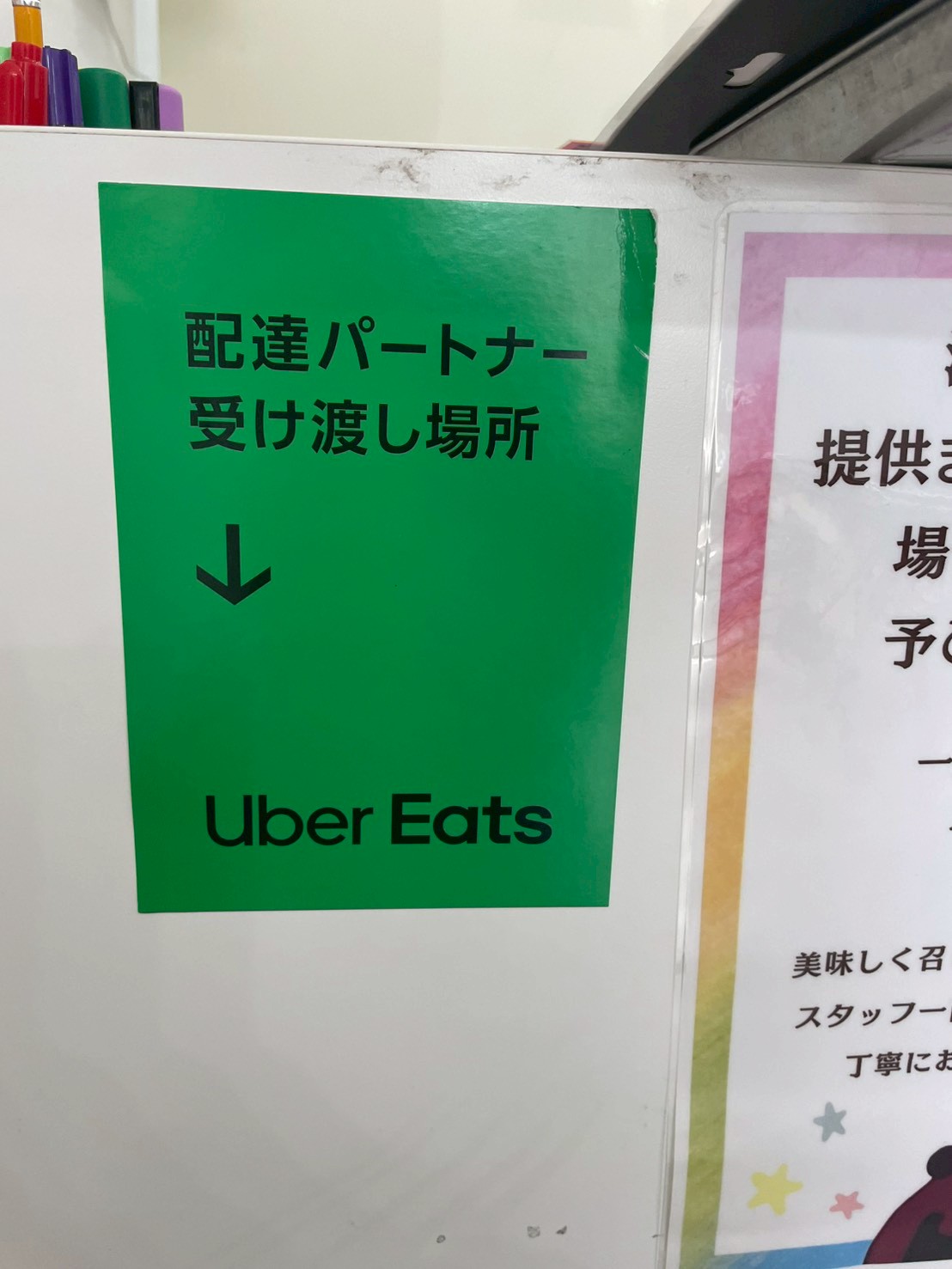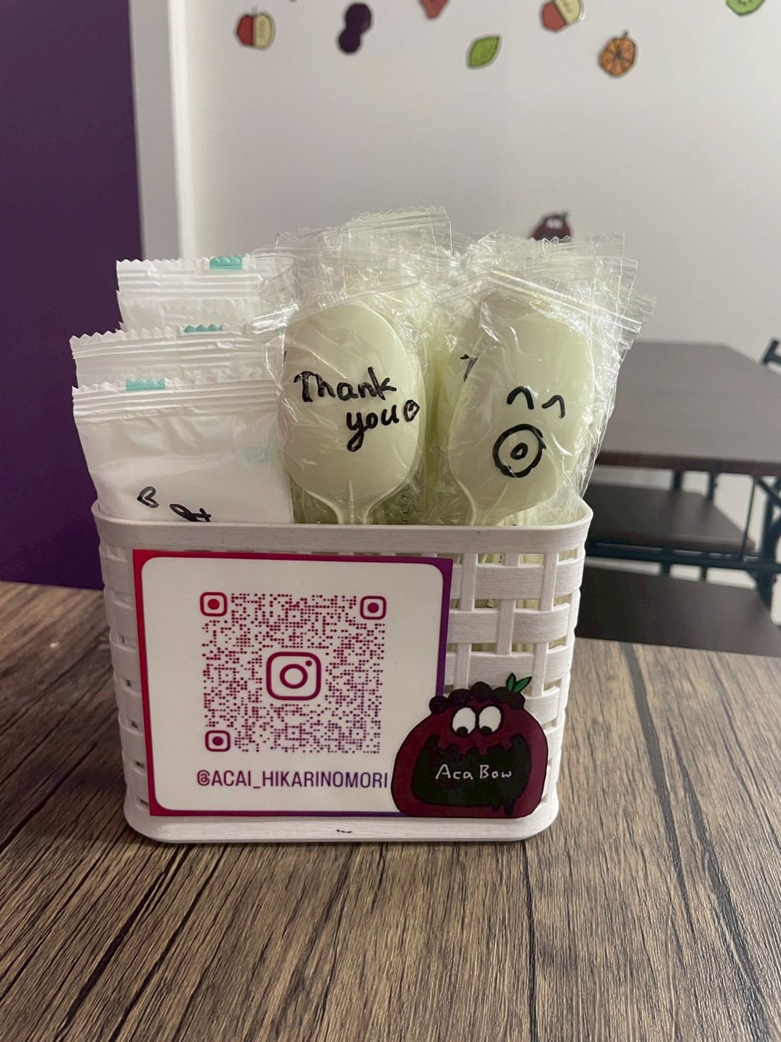 今回はイートインを選択したので、注文した後はこちらのお席で待ちます!席の決め手は後ろの壁紙のキャラクターの可愛さです。