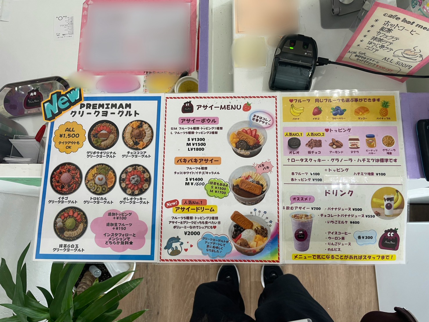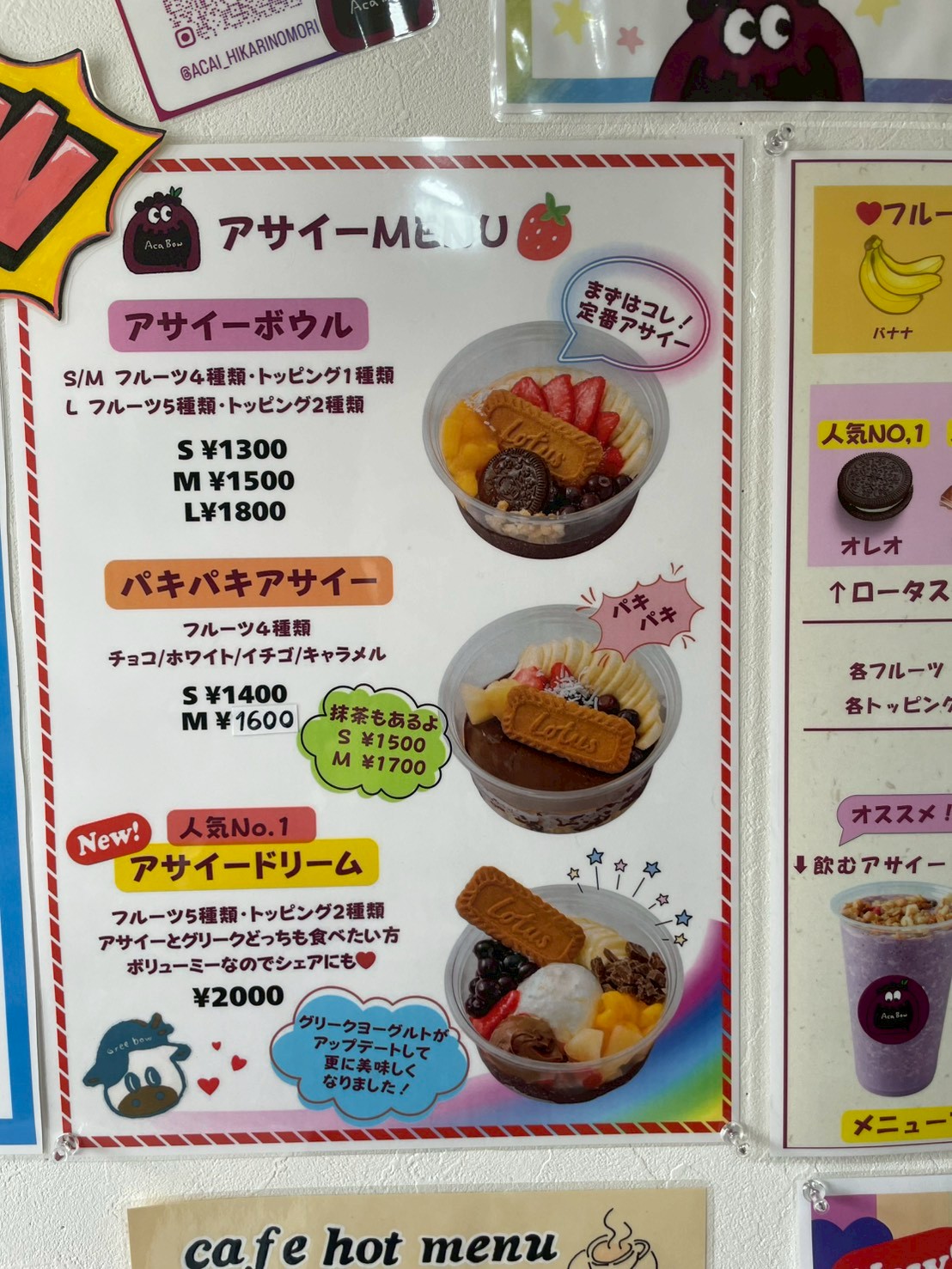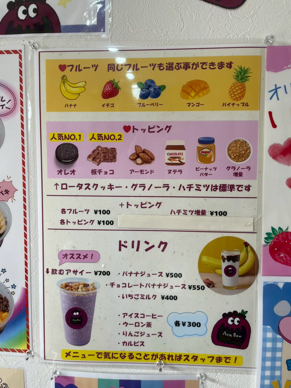 アサイーに付けられるフルーツ、トッピングはここから選びます。アサイー以外にもドリンクメニューが多くあります!