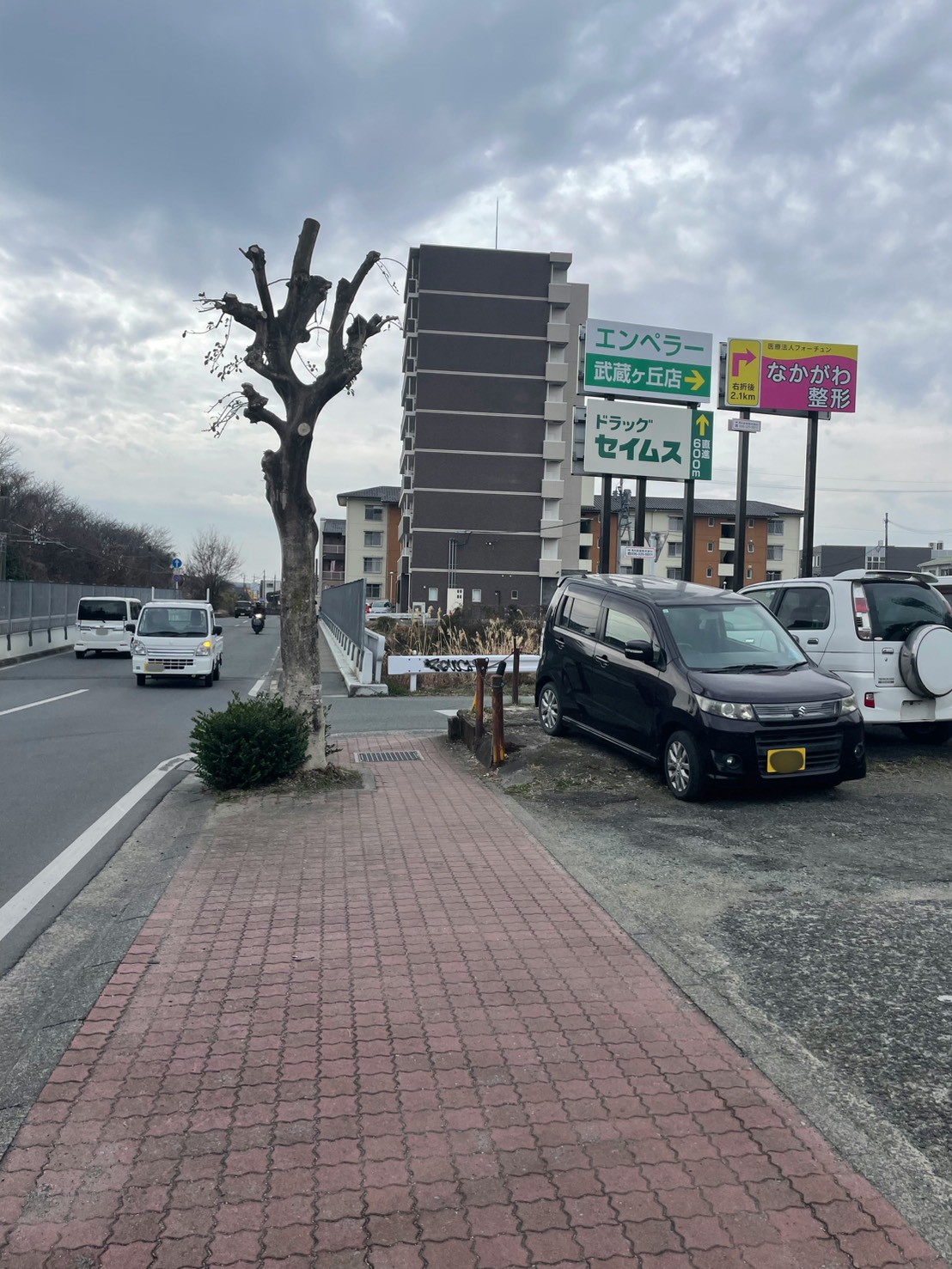 「エンペラー 武蔵ケ丘店」さん、「ドラッグ セイムス」さん、「なかがわ整形」さんの看板が見えてきたら右に曲がります。