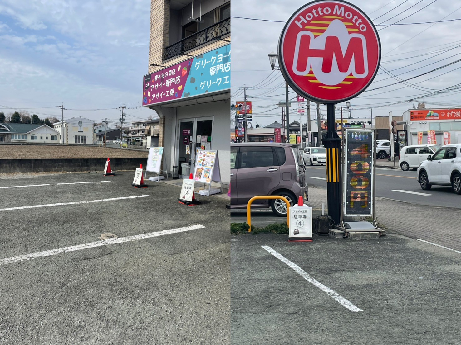 駐車場はお店の前に3台、「ほっともっと 武蔵ケ丘店」さんの看板の前に1台。