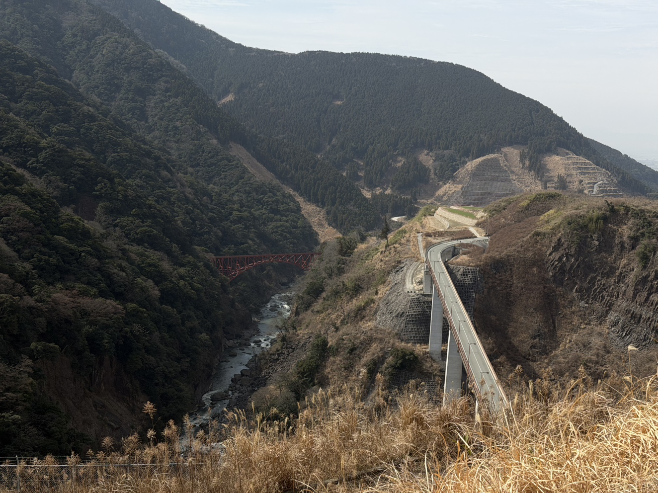 「ヨ・ミュール」の展望スペースからは、同じく被害を受けた長陽大橋や、そして甚大な被害を受けるも、2023年に全線運転再開をした南阿蘇鉄道の赤い鉄橋、第一白川橋梁(きょうりょう)も望むことができます。