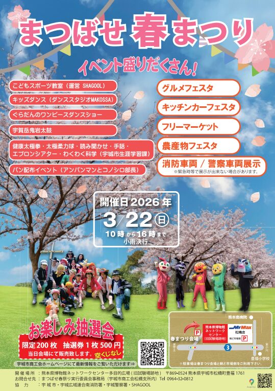 宇城市松橋町の春の訪れを告げる地域の祭典です。熊本県博物館ネットワークセンターの広場を会場に、地元グルメのキッチンカーやフリーマーケットが並び賑わいます。お子さま向けにかけっこ・野球・サッカーなどのスポーツ体験教室も充実しており、家族全員で楽しめる一日。春の陽気の中、地域の方々との交流も楽しめるほのぼのとした祭りです。