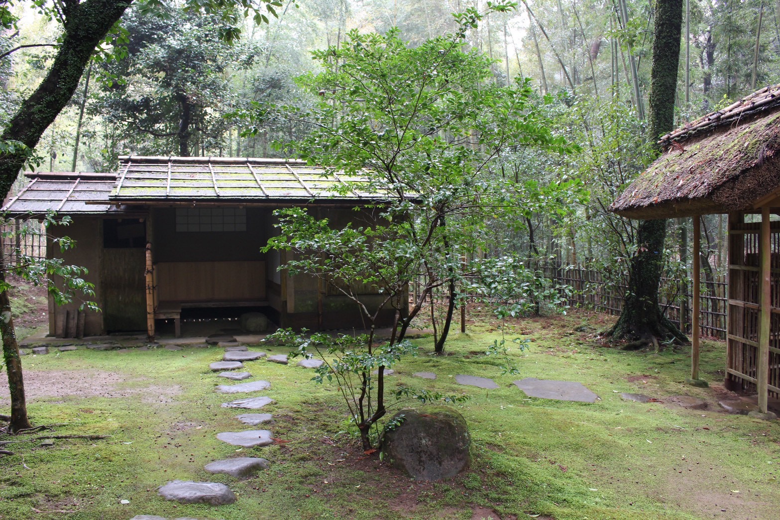立田自然公園には、細川忠興の起こし絵図に基づいて復元された茶室「仰松軒(こうしょうけん)」があります。