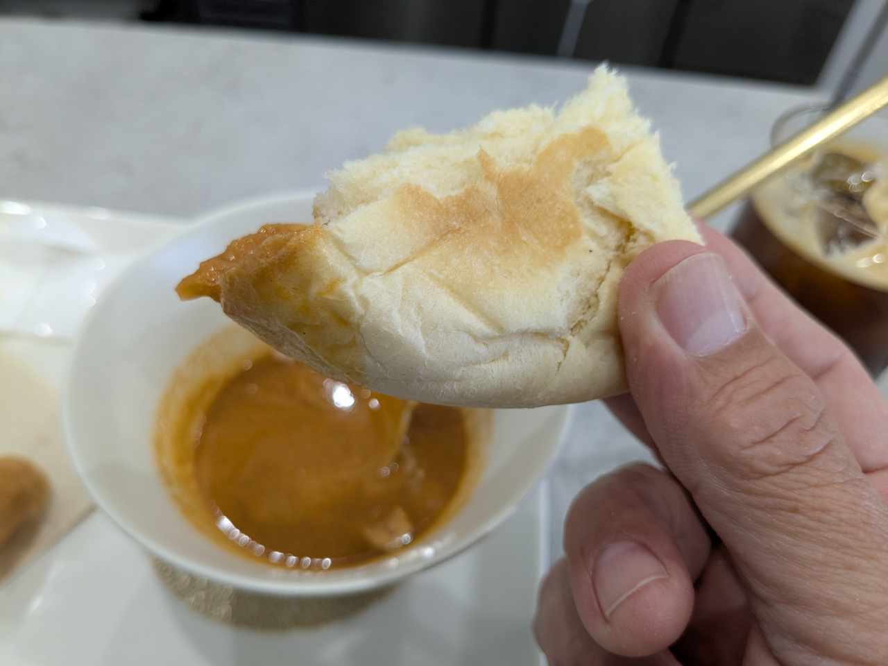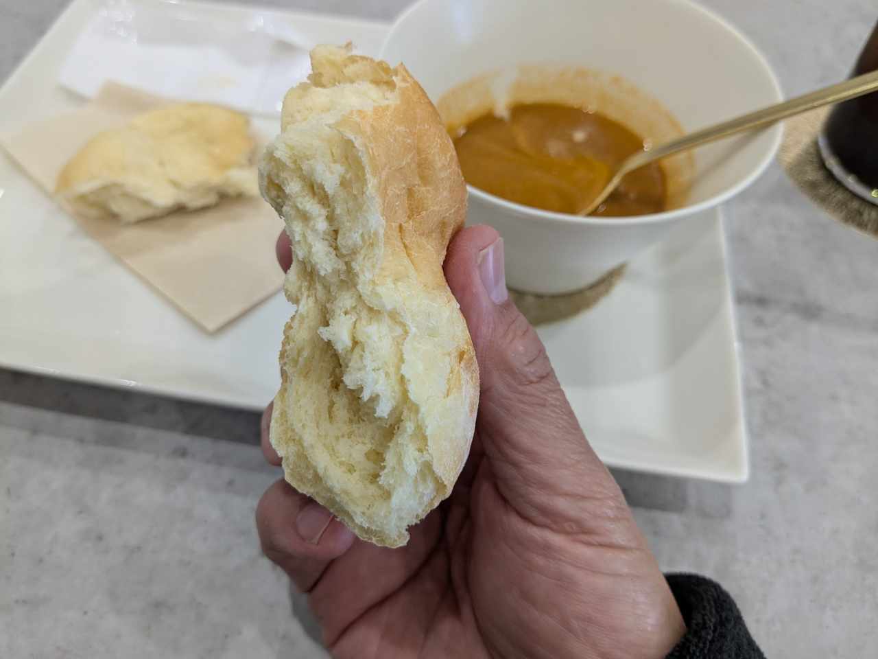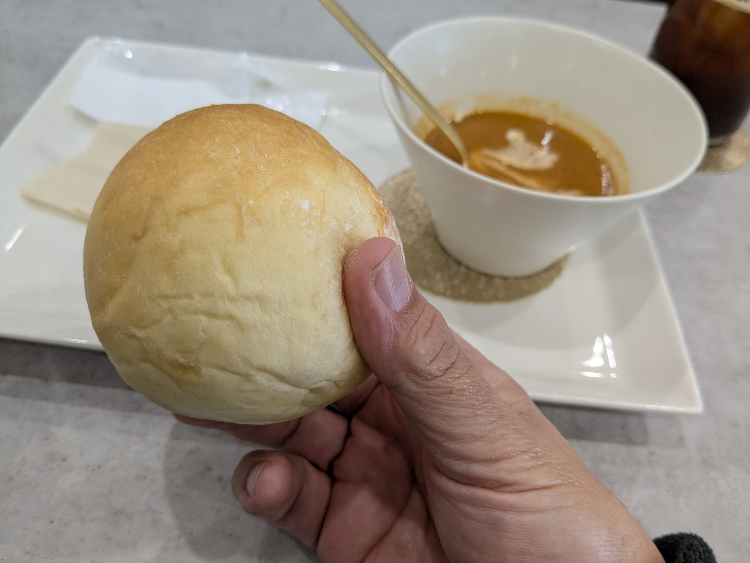 王道の食べ方! パンにスープを浸していただきます。