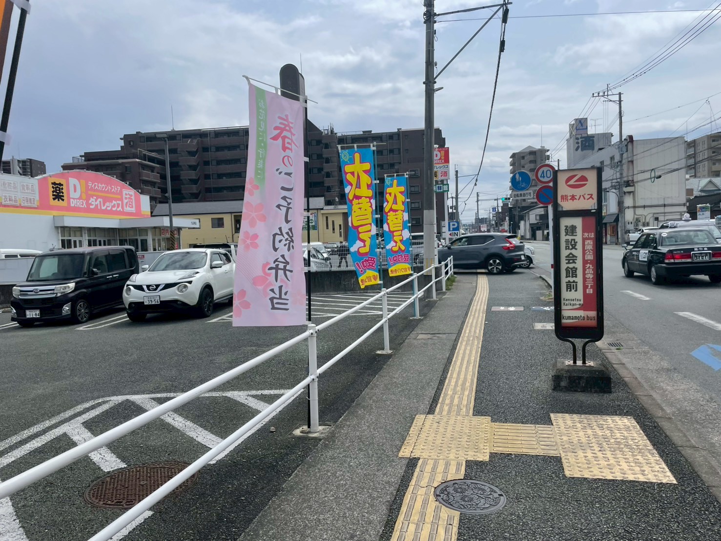 最寄りのバス停は「熊本バス 建設会館前」です。ここから横断歩道を渡って少し歩くとお店に辿り着けます!