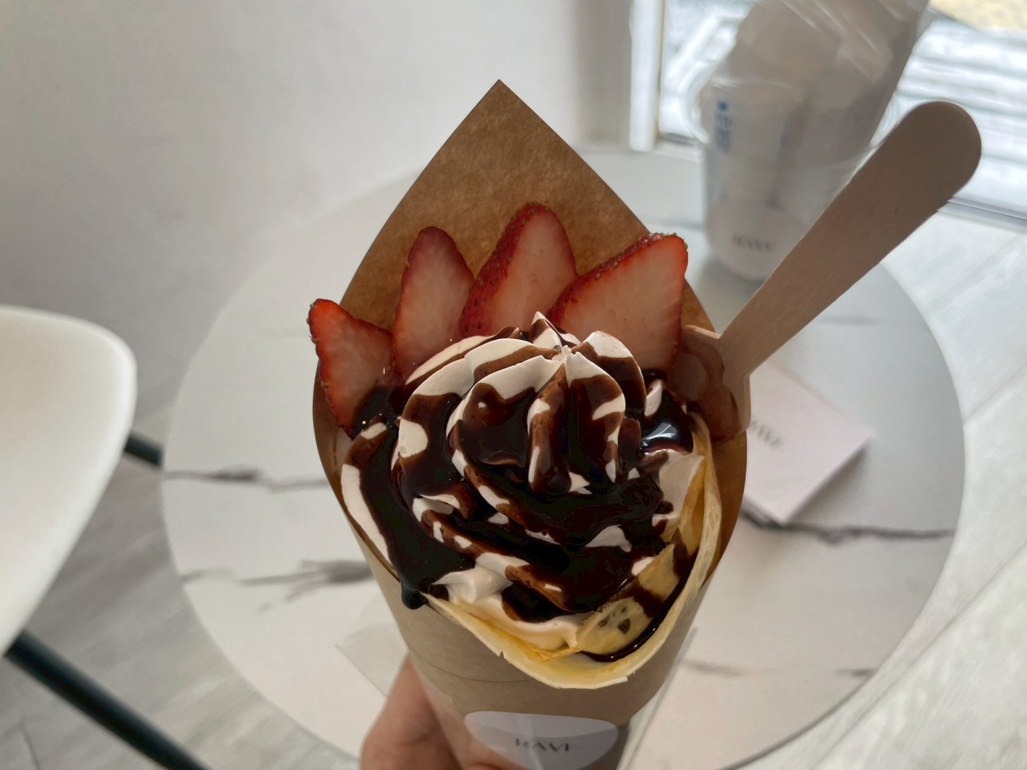 いちごとホイップがふんだんに使われているクレープ。そしてさらにその上にたーっぷりのチョコソース!これは大優勝の予感しかしませんよね…!
