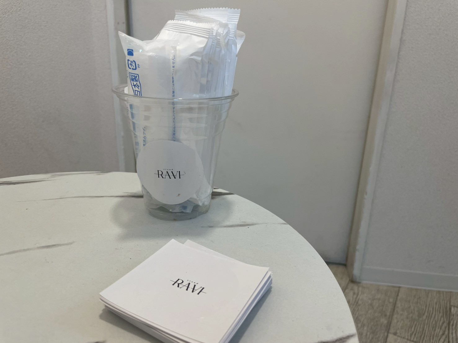 イートインコーナーのテーブルにはお手拭きと「stand RAVI」さんのステッカーが…!お店に来た記念にもなりますね!
