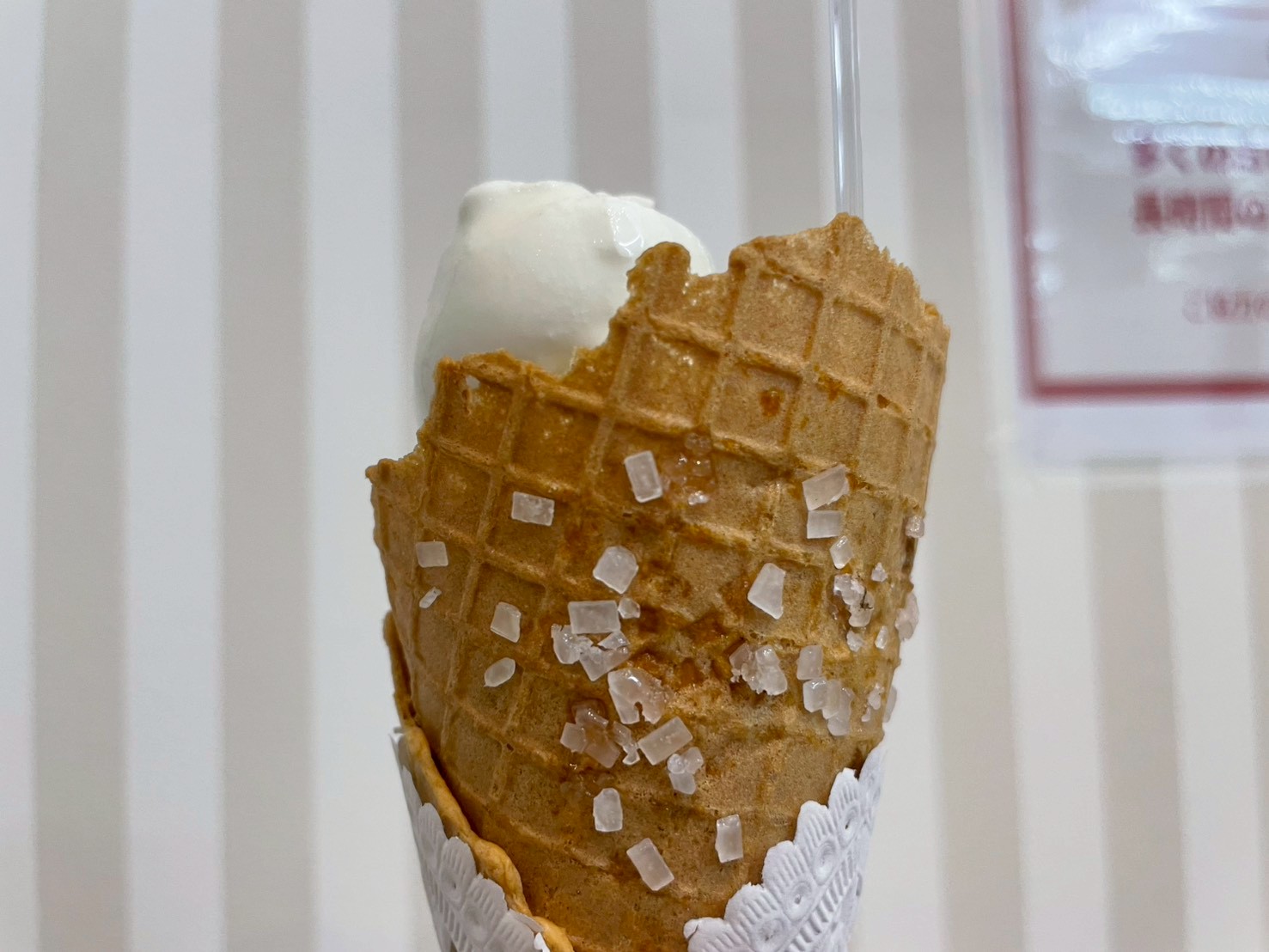今回、私は手焼きコーンを選んでみました!ここのお店の手焼きコーンの推しポイントはこの”大粒のザラメ”。このザラメが生み出すワッフルコーンのザクザク食感とミルクの濃厚さが最高に合うんです!コーンだけでもパクパクいけちゃいます!!