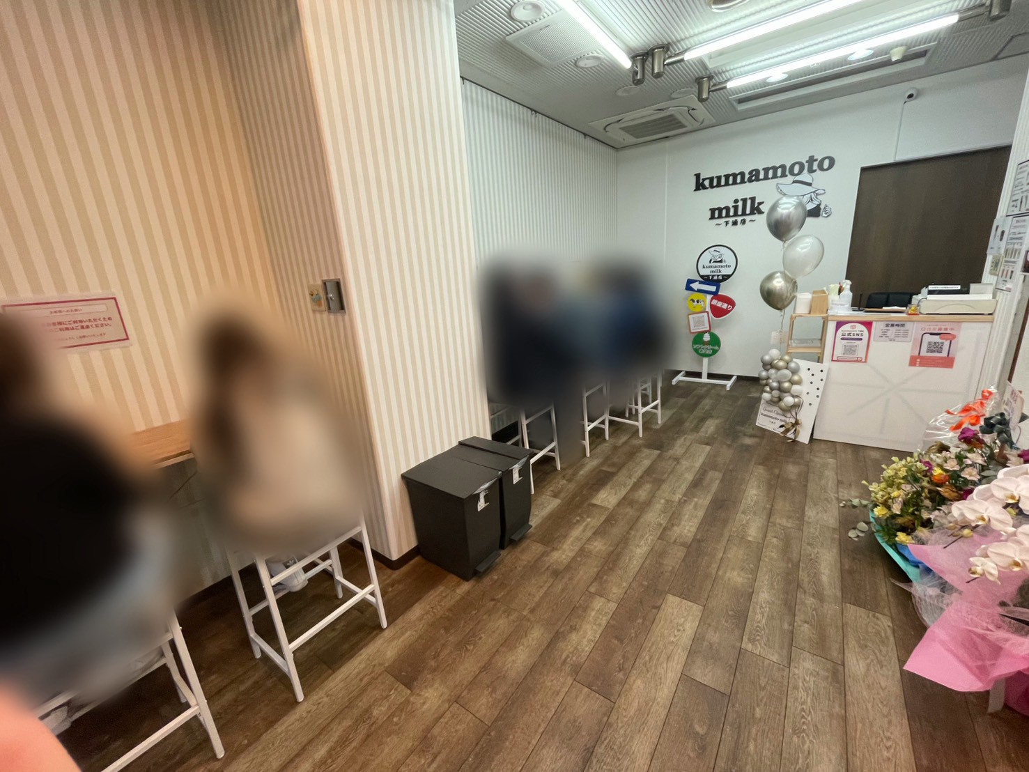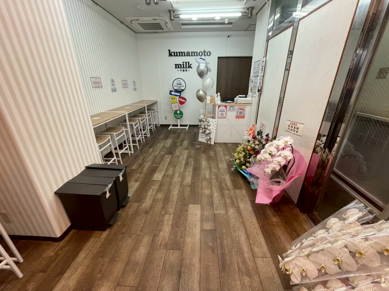 ガラス扉の向こうにはたくさんのお客さんが!オープン記念のお花もたくさん見られます。
