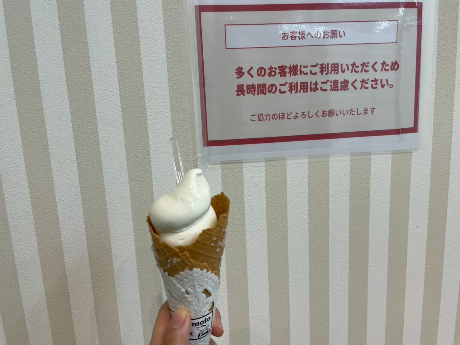 イートインスペースでソフトクリームを楽しんでいると、お店の方から一言。