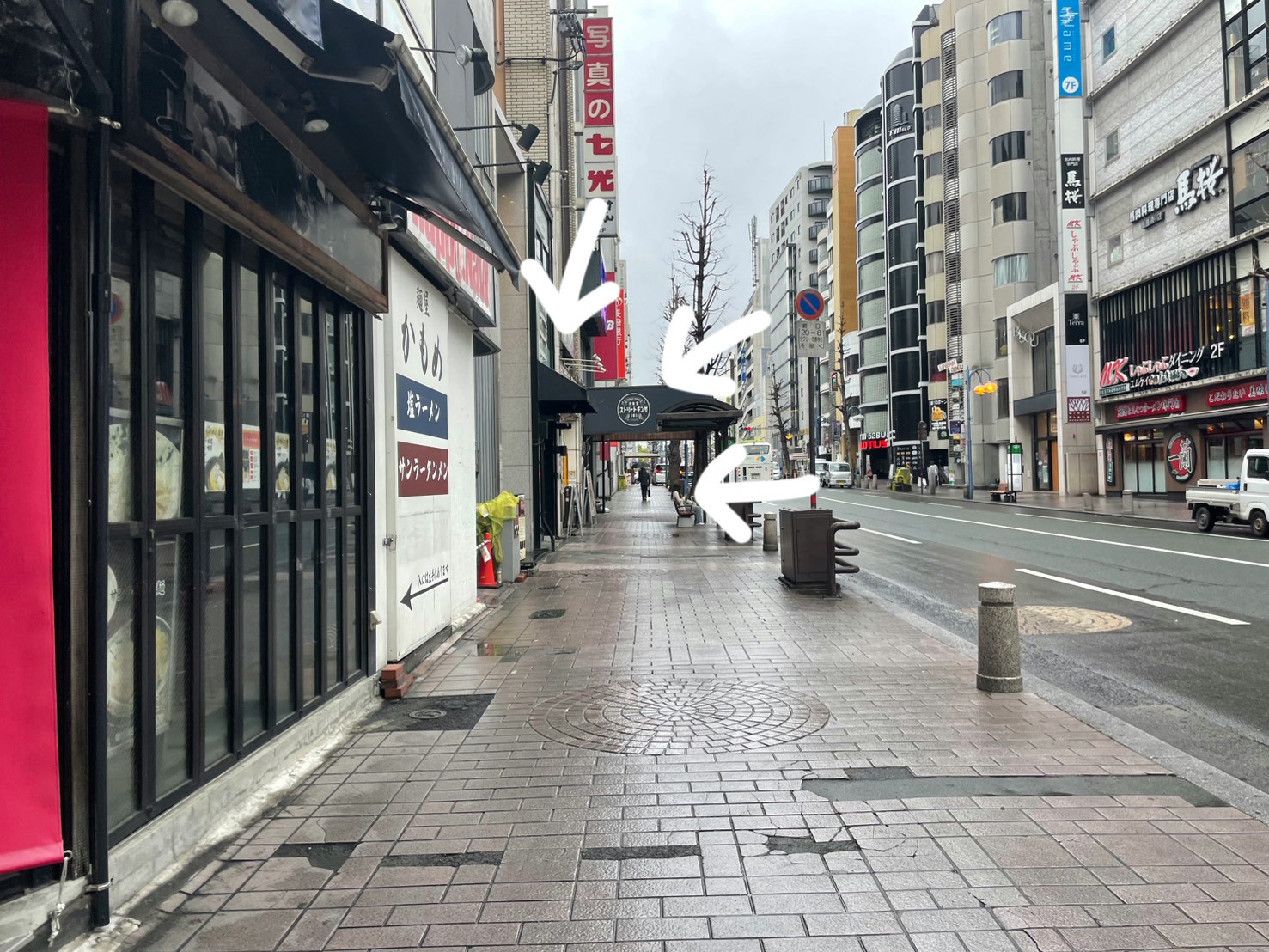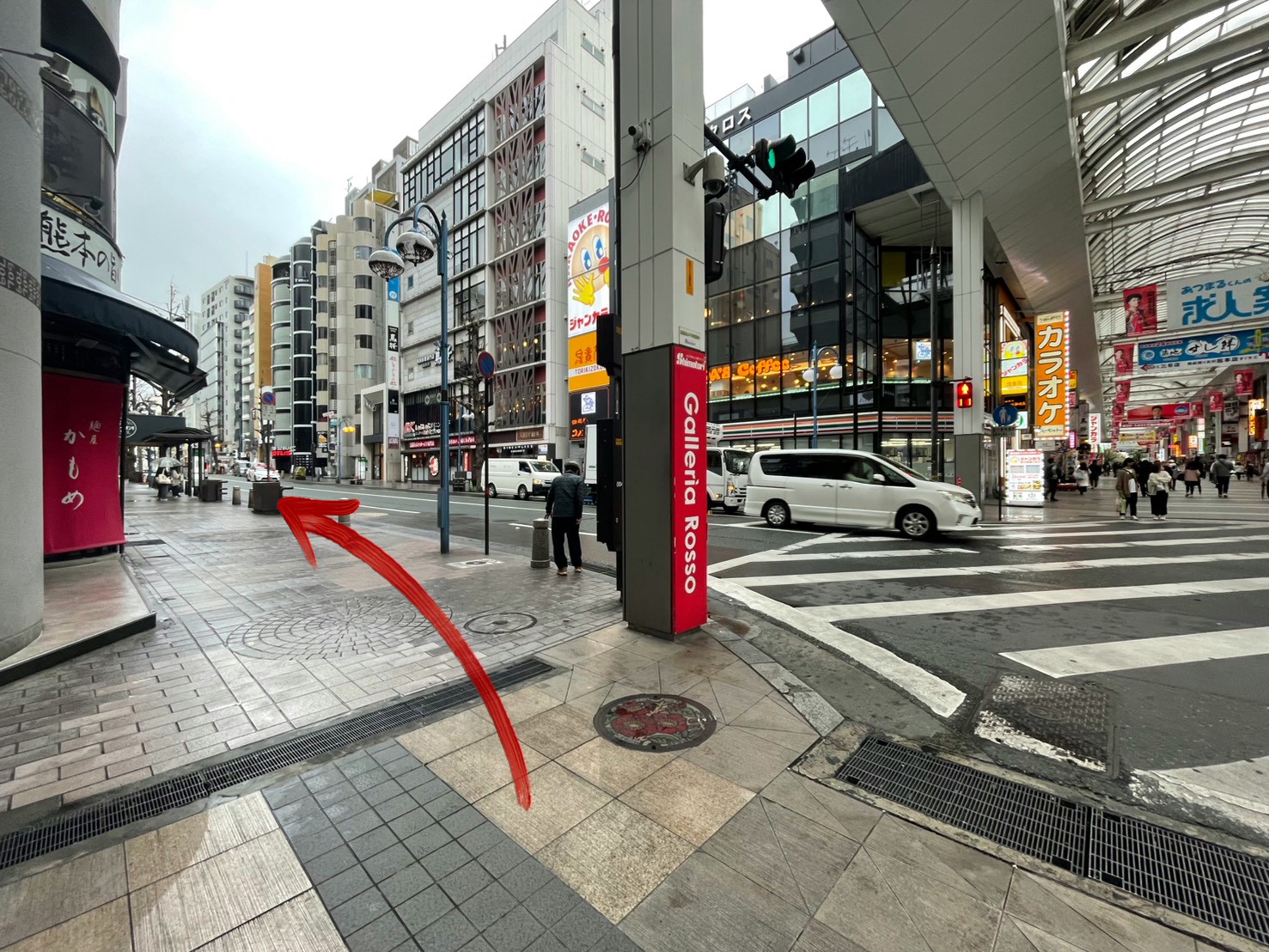 「カラオケ館 下通り本店」さんや「MARUTAKE」さん横の信号が見えてきたら、横断歩道を渡らずに左に曲がります。
