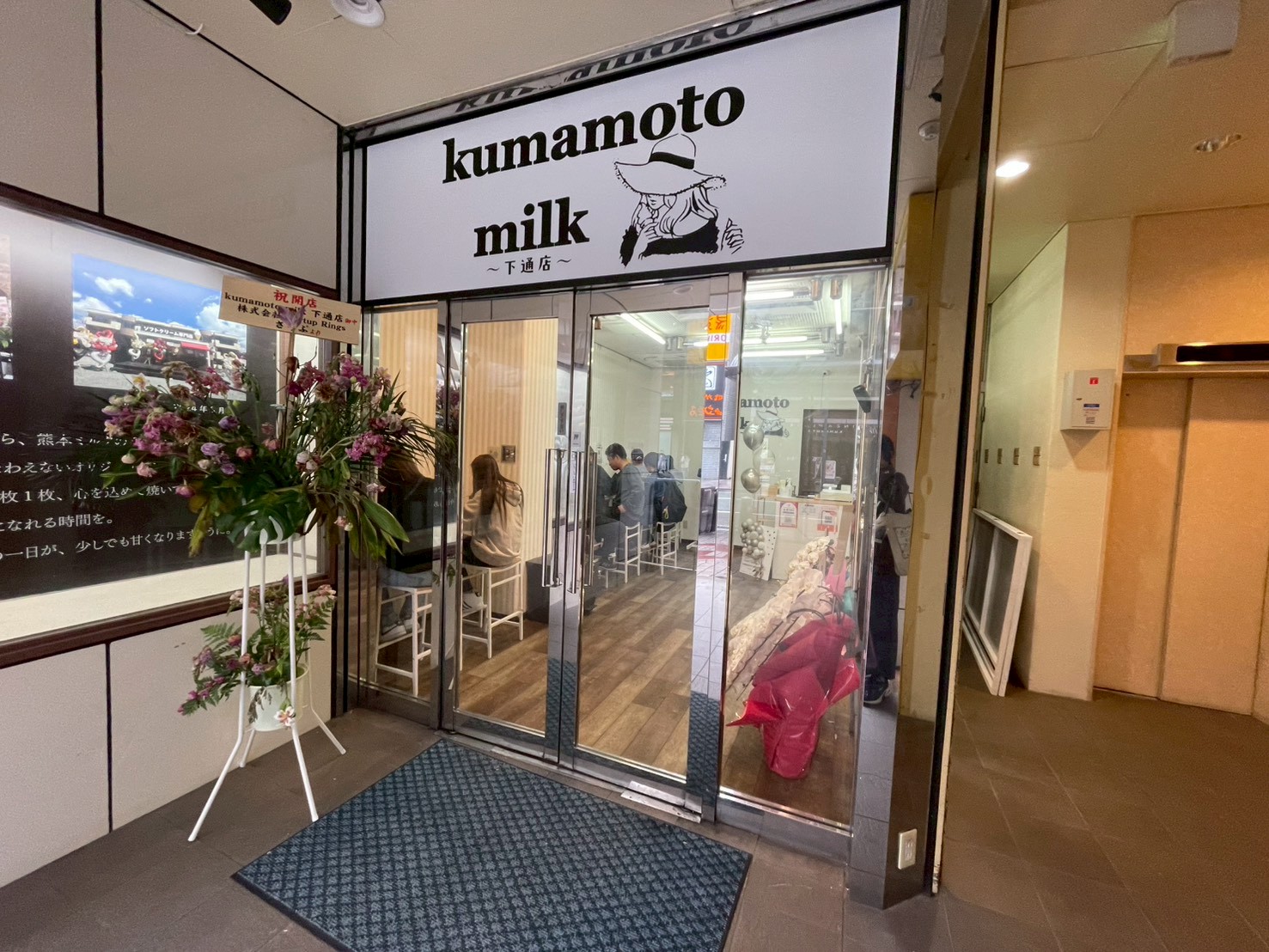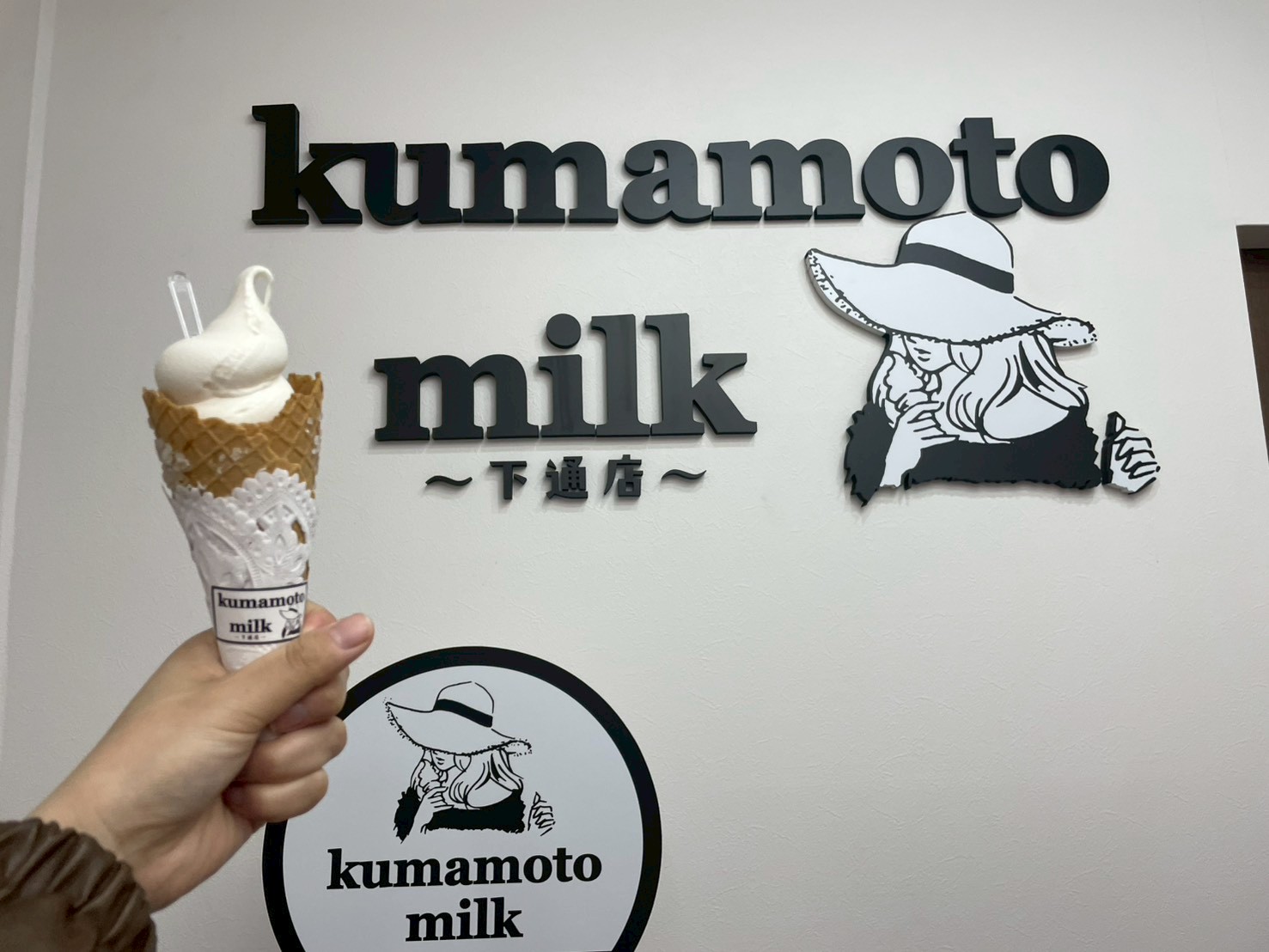「kumamoto milk~下通店~」の店名と帽子を被った女性が描かれた白い大きな看板の下がお店の入口です!
