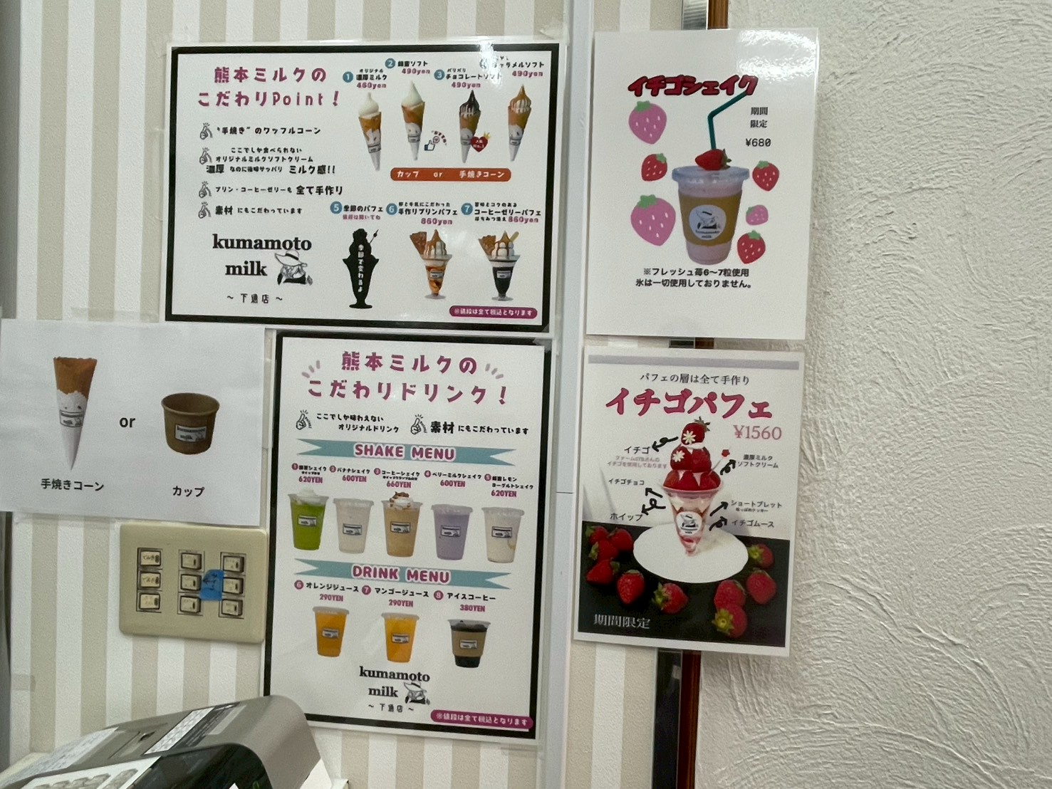 レジのすぐ横の壁にはメニューが貼られています!ソフトクリーム以外にも、氷を一切使わないイチゴシェイクなど素材にこだわったドリンクメニューもたくさんあります!イチゴパフェやイチゴシェイクは数量限定です。