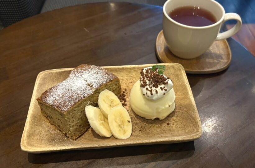 どれも美味しそうで迷いましたが、メニュー上の「おすすめ」という文字に惹かれ、バナナケーキを選びました。