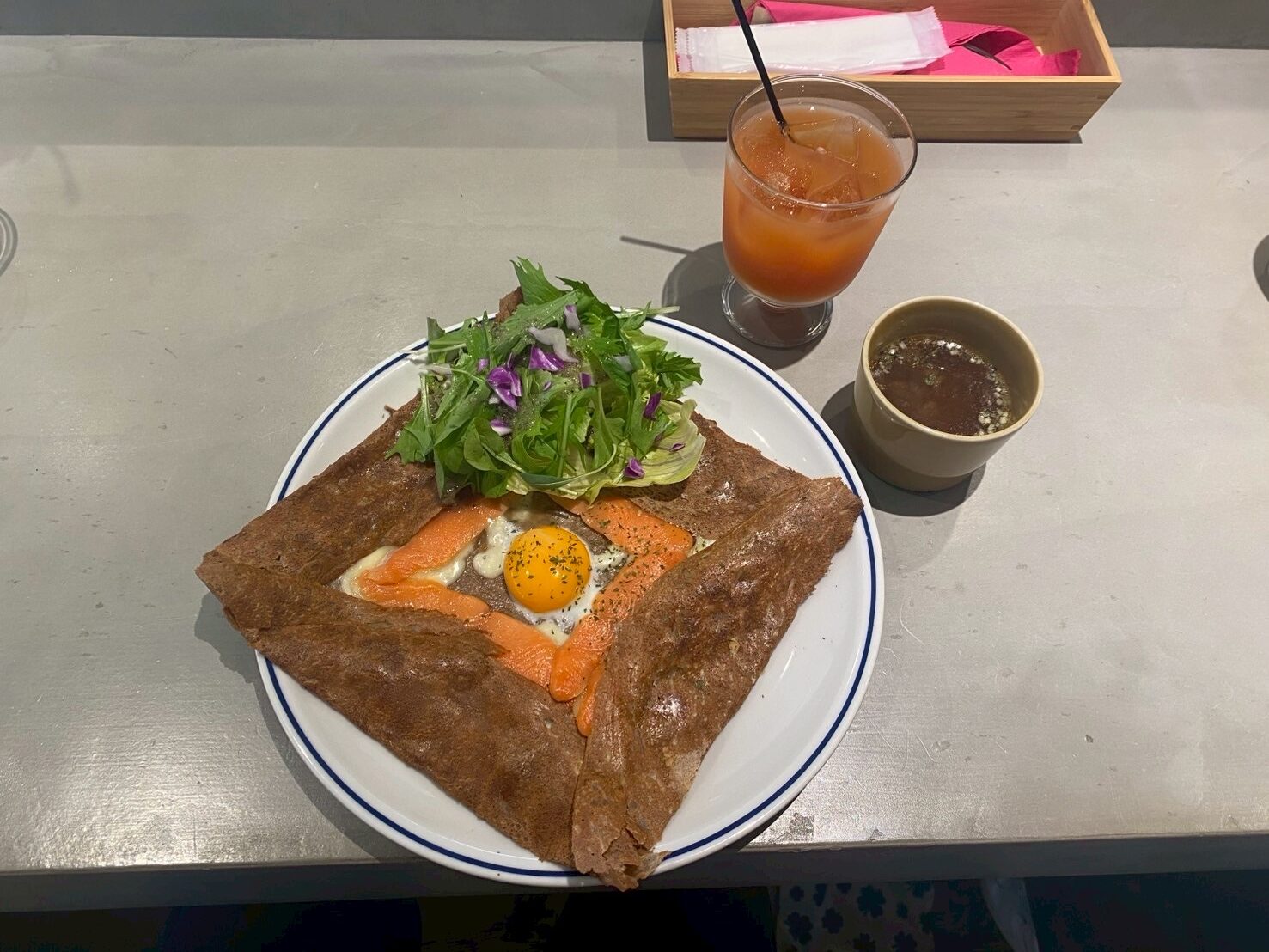 スモークサーモン、チーズ、たまごが包み込まれており、サーモン好きにはたまらないガレットです!