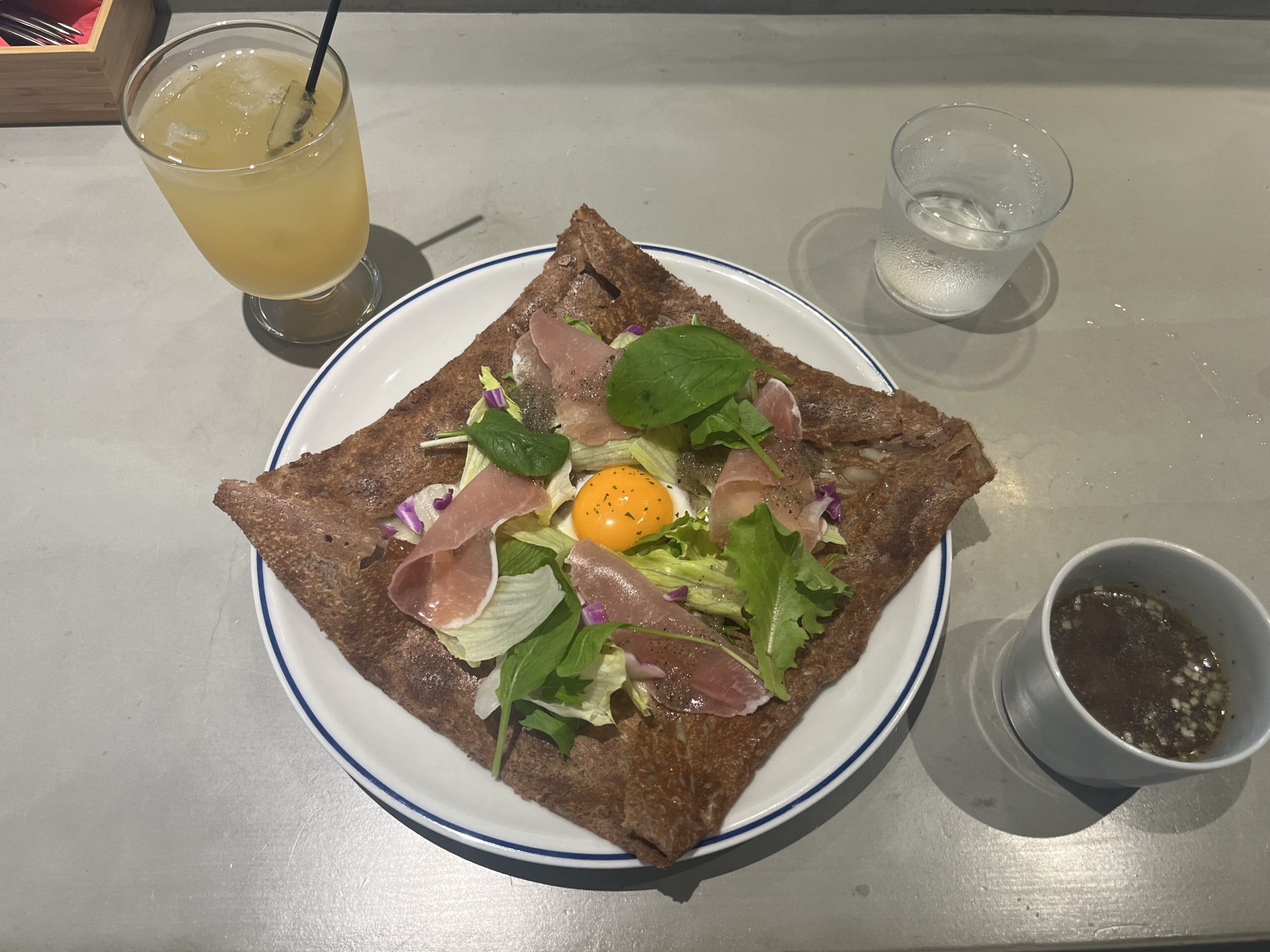 ガレットの定番はハムとたまご、チーズということで定番に近い組み合わせですが、生ハムなのでよりサラダとマッチしている感じがします。