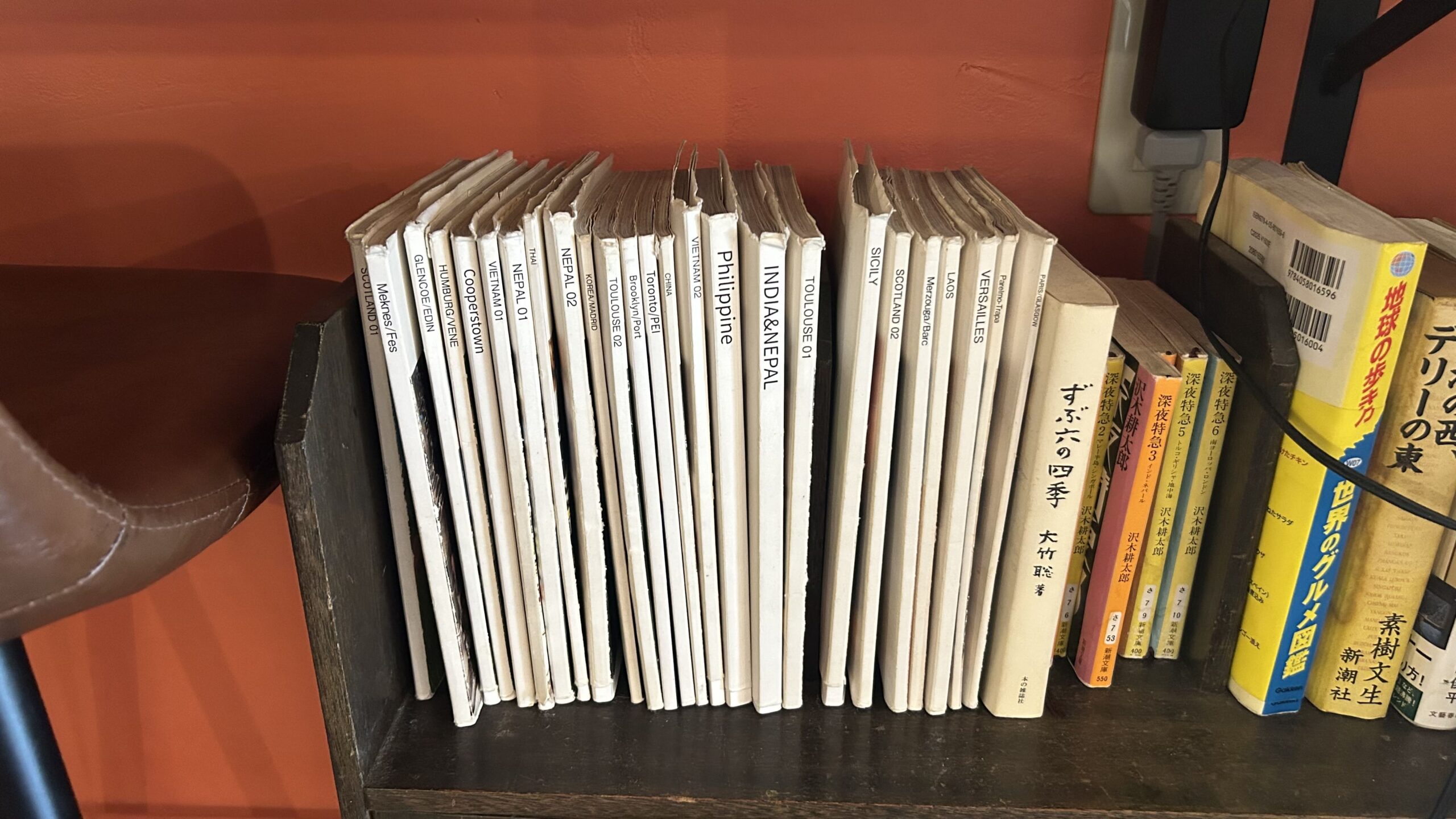 こちらは商品ではないのですが、雑貨や古着を買い付けた旅の様子を本棚に並ぶアルバムで見ることができます。