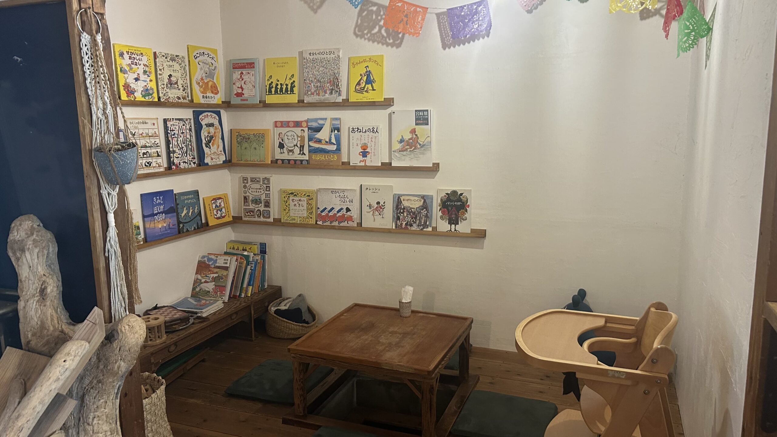 奥のキッズルームには絵本やおもちゃが置かれています。