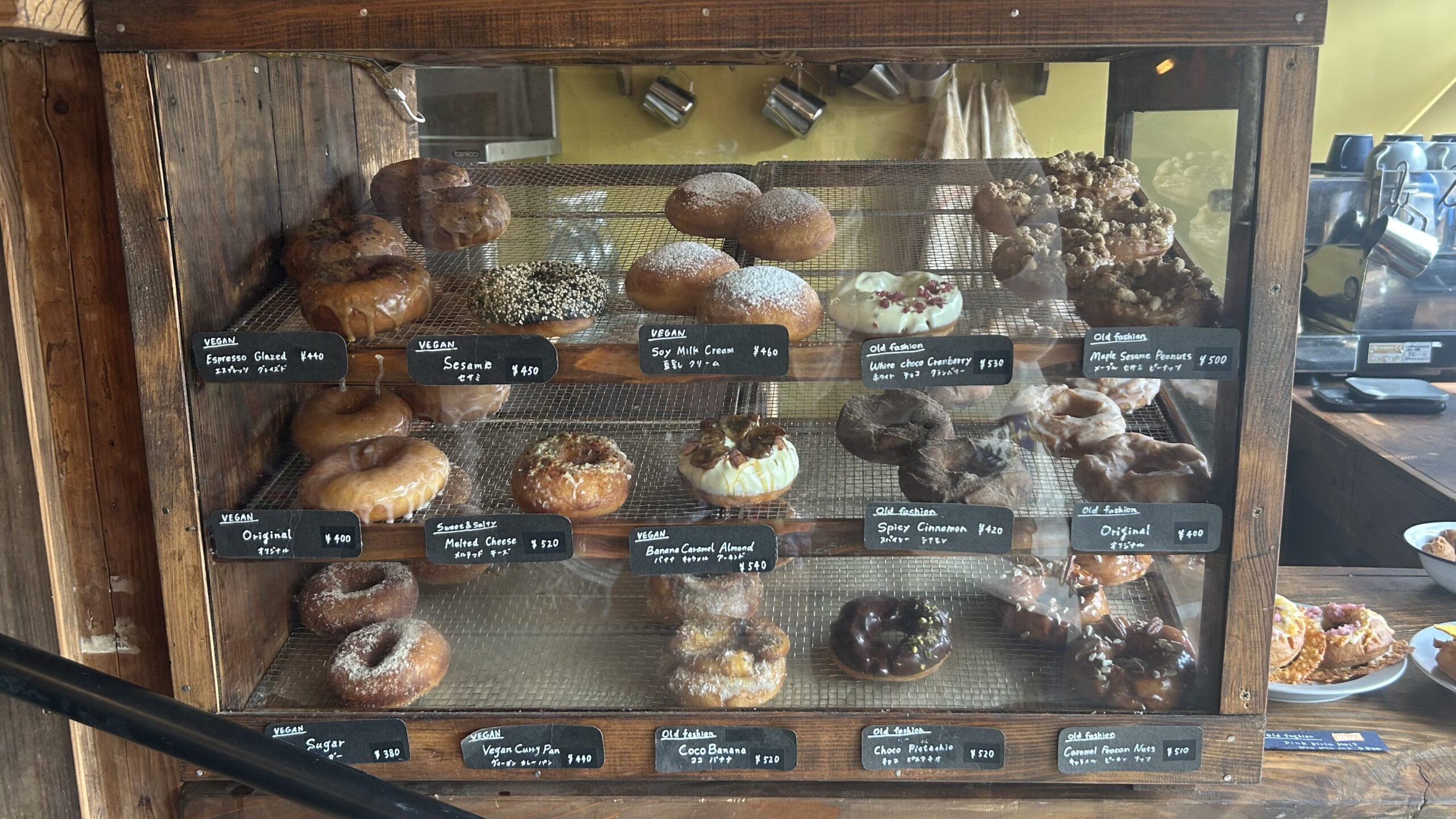 ふわふわの生地のヴィーガンドーナッツと、オールドファッションドーナッツの2種類の生地があります。