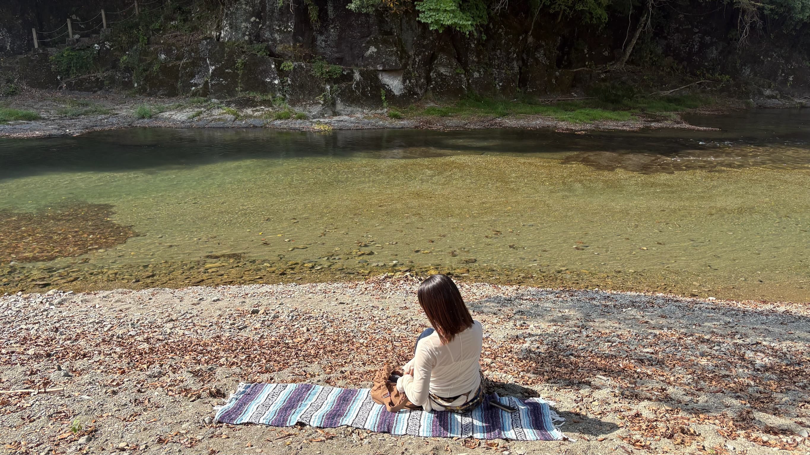 お店から歩いてすぐのところに川があるので、ラグを広げて自然を感じながらのんびり過ごすことができます。