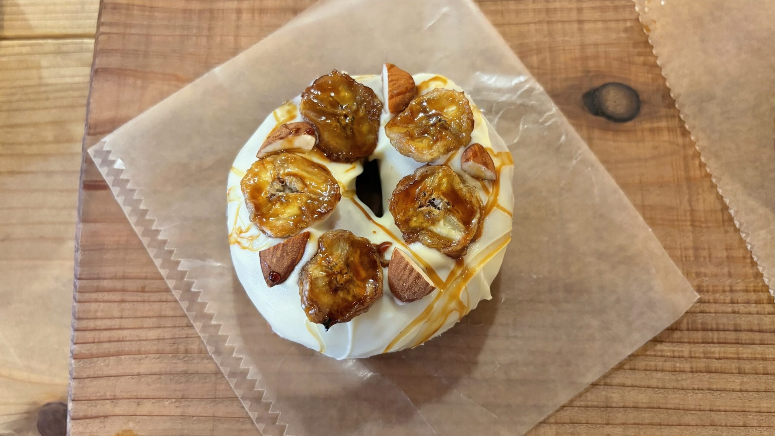 ホワイトチョコとキャラメルでコーティングされ、ドライバナナとアーモンドのトッピングで甘さも満足!