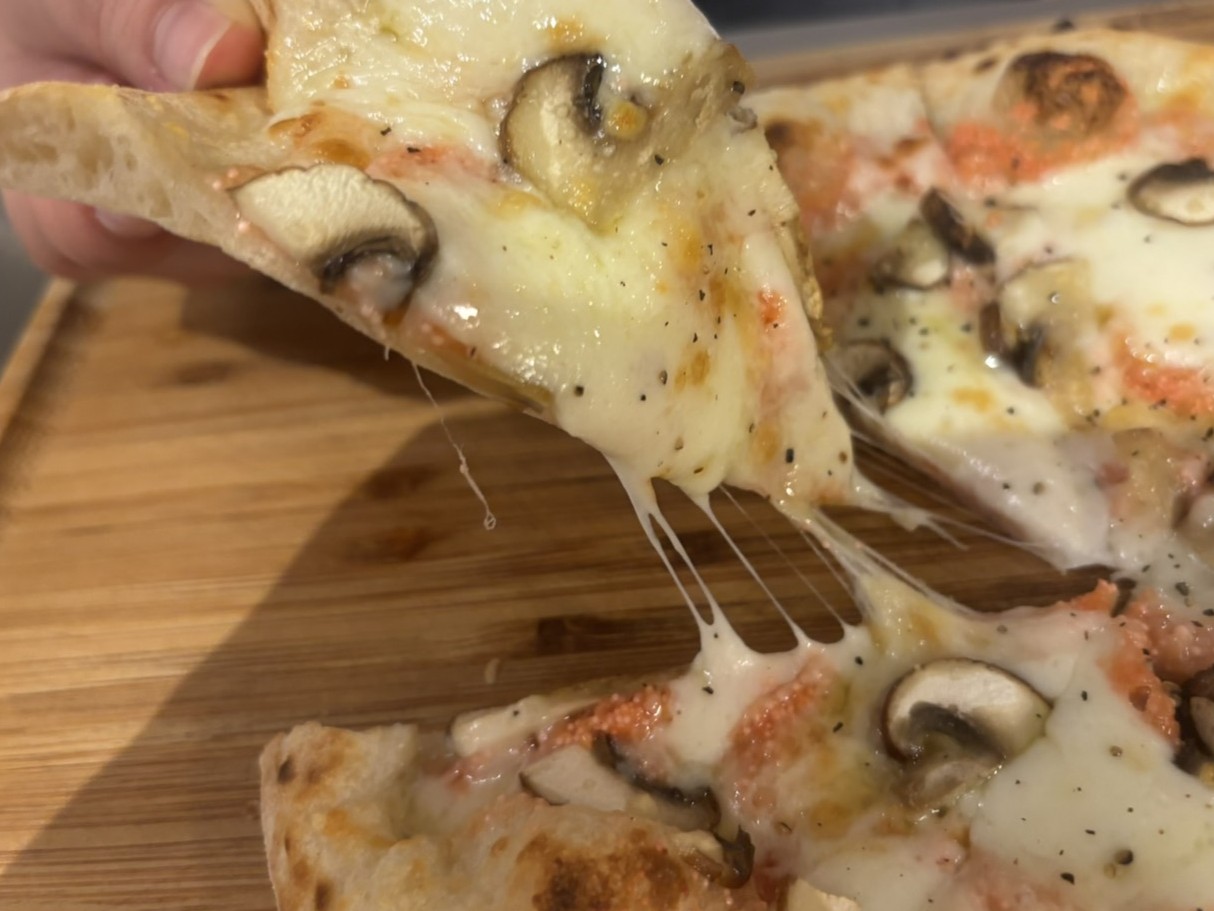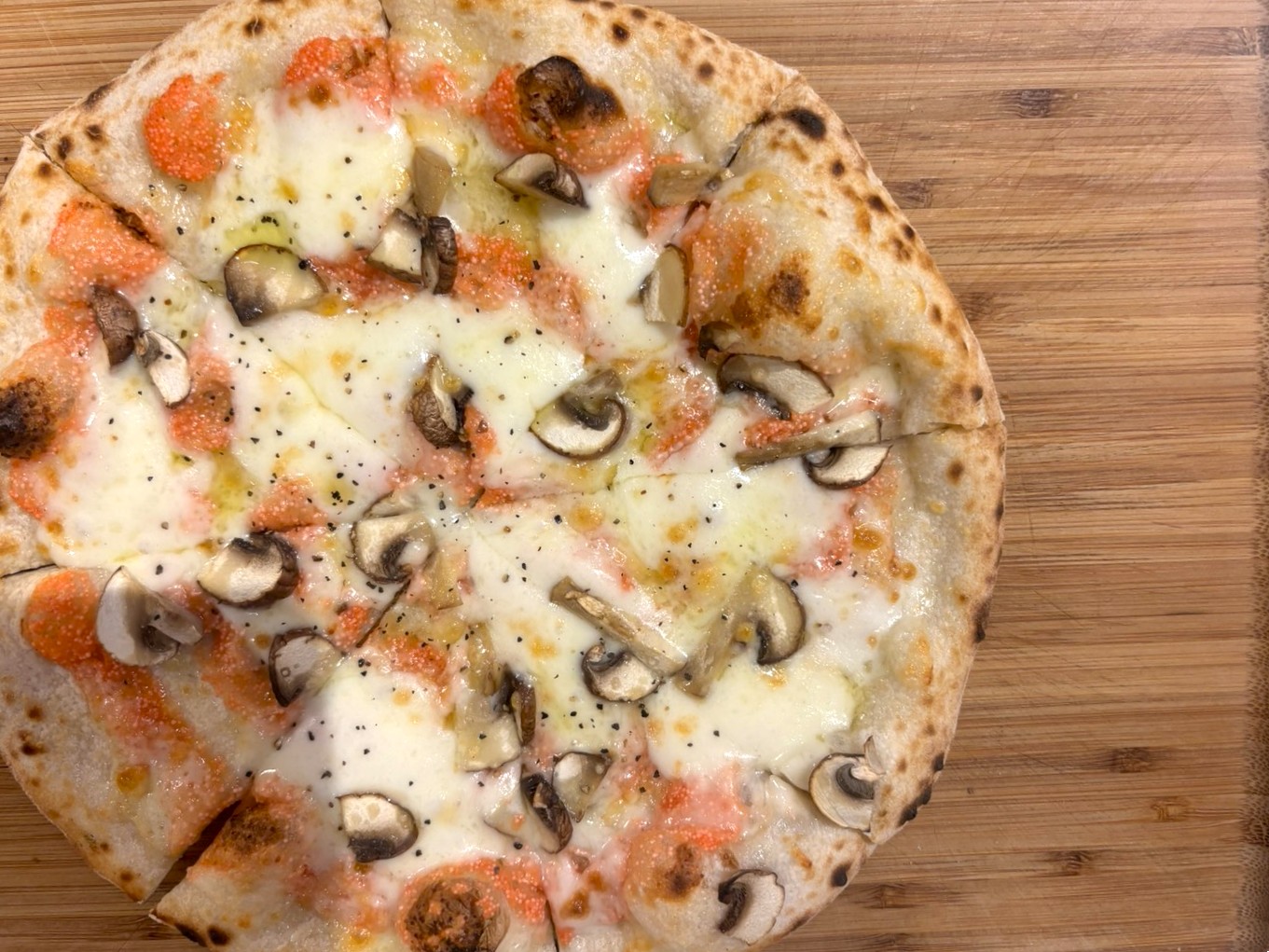 明太子の旨みとマッシュルームの味わい、そして丁寧に仕込まれたピザ生地の香りが絶妙にマッチ。
