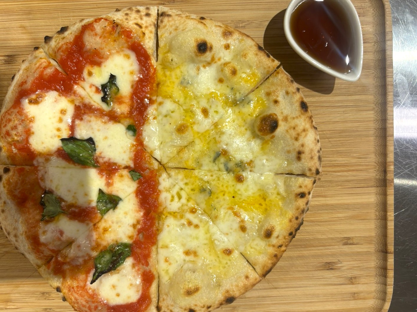 定番マルゲリータとクワトロ、どちらも楽しめるハーフ&ハーフのピザはどちらも欲張って食べたい時にピッタリ!