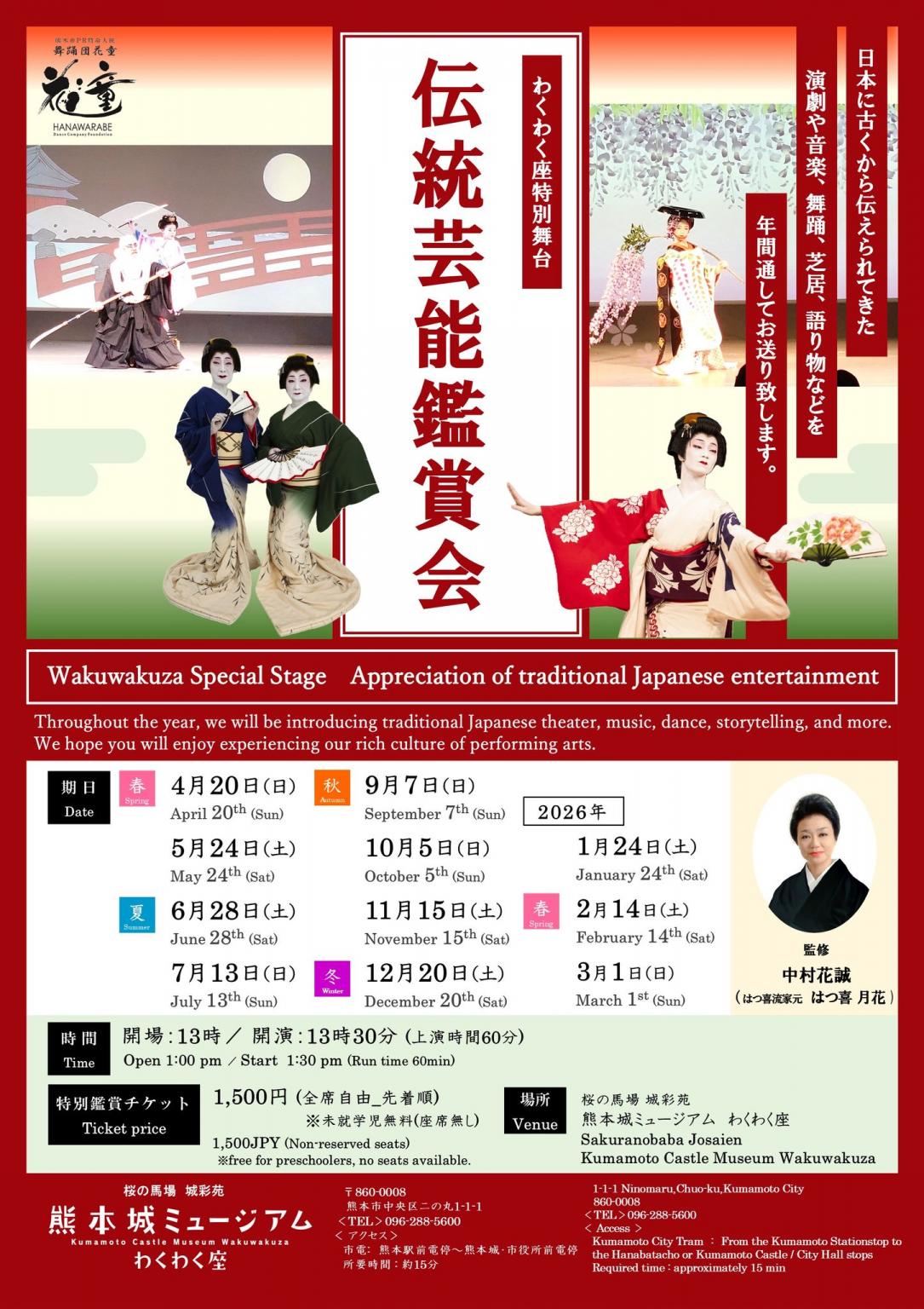 熊本の文化に触れながら、格式ある日本の伝統芸能を体験できる貴重な機会です。開場は13時、開演は13時30分で、全席自由席(先着順120席)となっています。