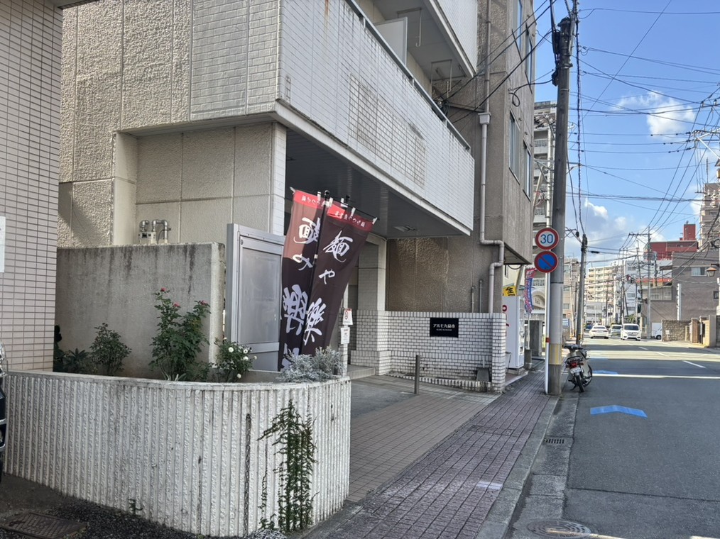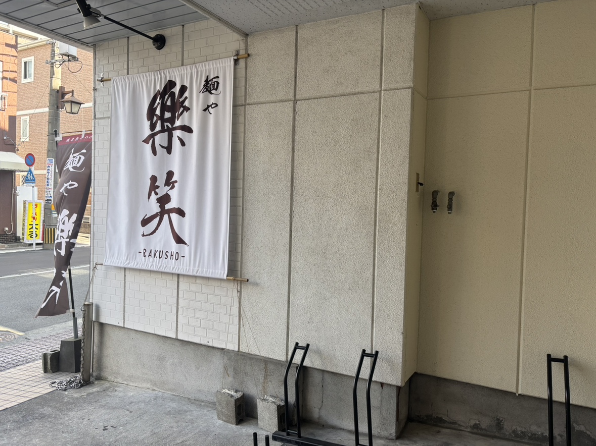 熊本市電・交通局前電停から徒歩5分。鎮西通り沿いにあり、「麺や 樂笑」さんののぼりが目印です。