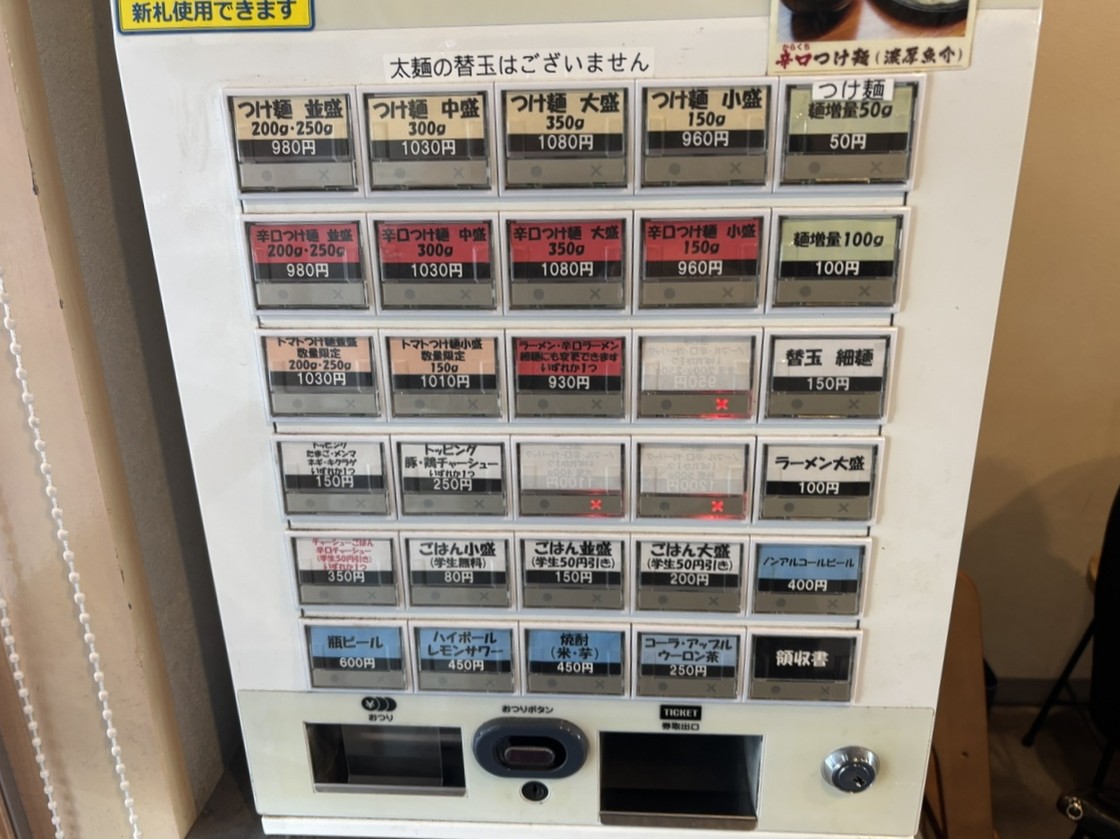 メインメニューは、魚介ベースのつけ麺と辛口つけめん。それにトッピングやごはんなどを追加することができます。