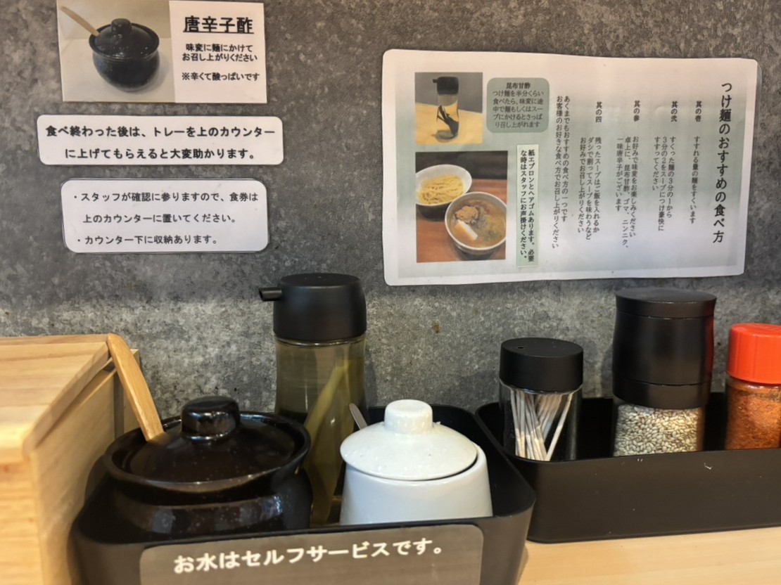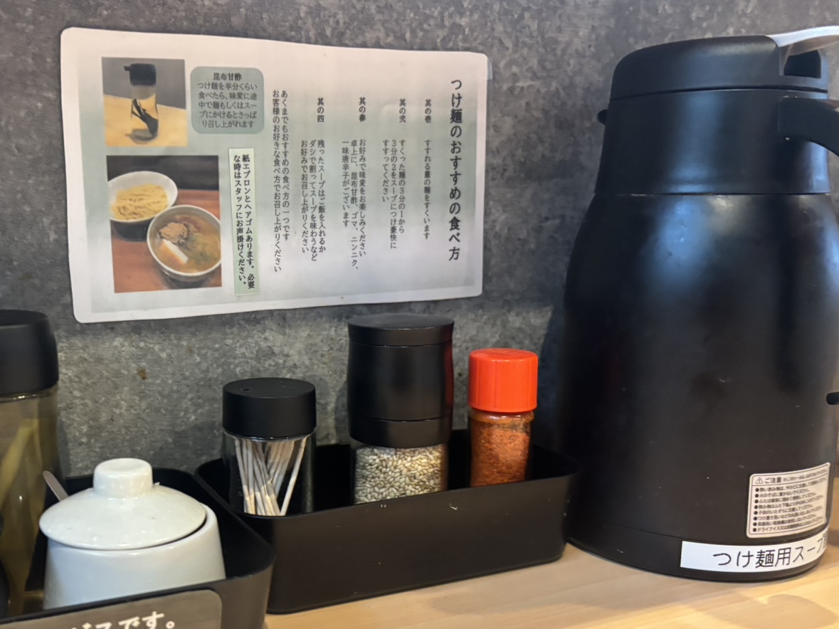 「麺や 樂笑」さんでは、スープ割り用の出汁もテーブルやカウンターに薬味とともに置いてあります。