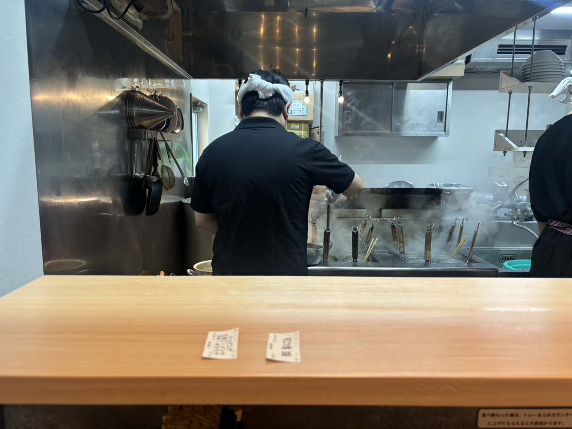 この日は1人で訪れたので、カウンターに案内されました。カウンター越しにのぞくと、麺を軽快に切る音、そしてスープの香りが食欲をそそります。