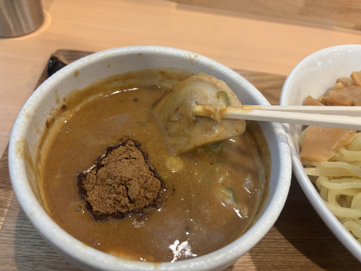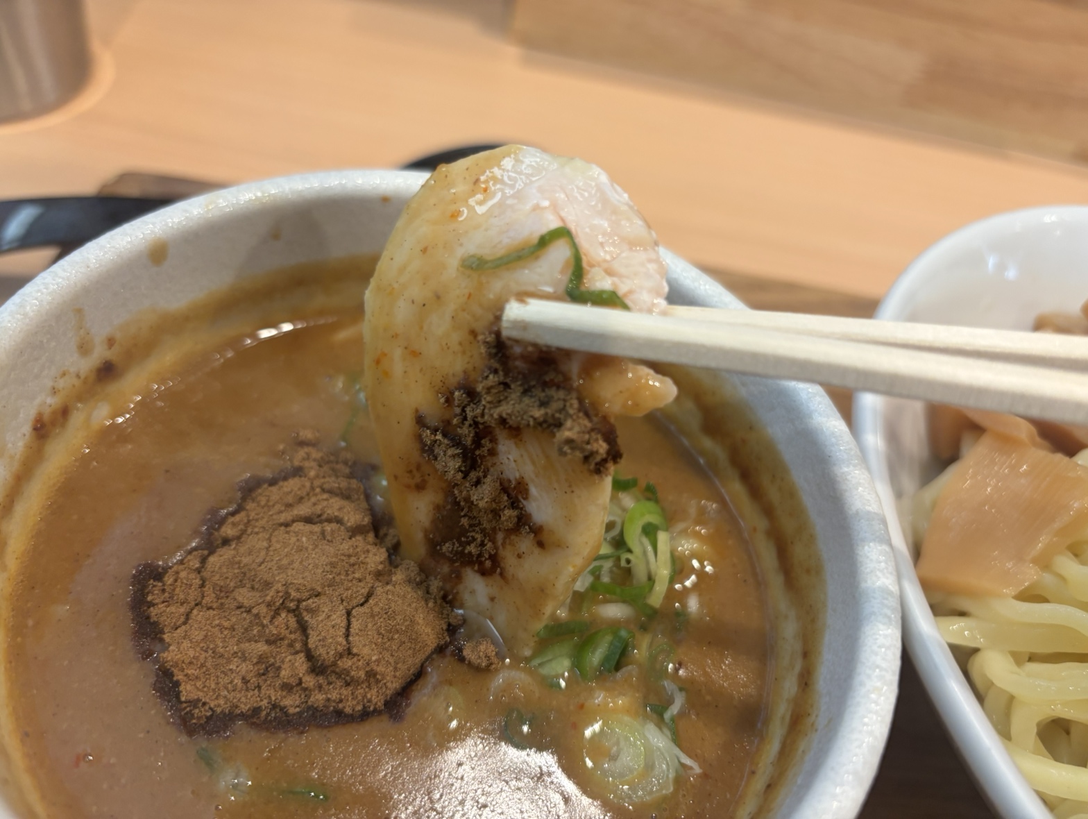 まずはつけ麺の具としては珍しい鶏チャーシュー。しっとりと仕込まれた鶏肉がスープといいバランスです。