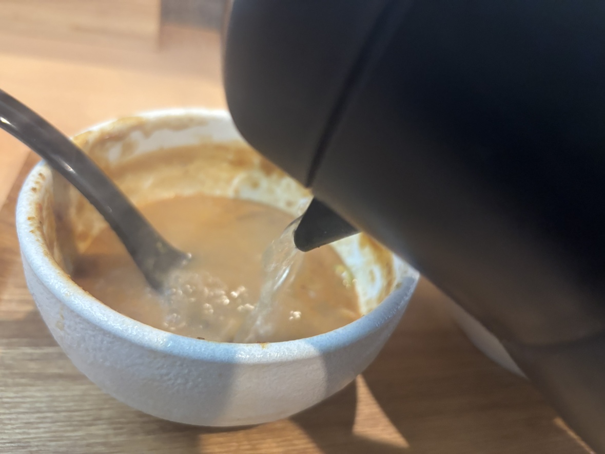 濃厚スープが、スープ割り用のだしでまろやかになり、最後の一滴まで美味しくいただけます。唐辛子の効果で体がポカポカ…!