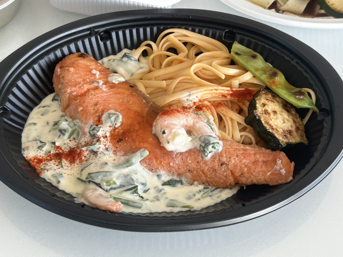 大きなサーモンが目を引くこの一皿は、程よく塩気の効いたシャケと、パスタに絡む濃厚なクリームソースが相性抜群!