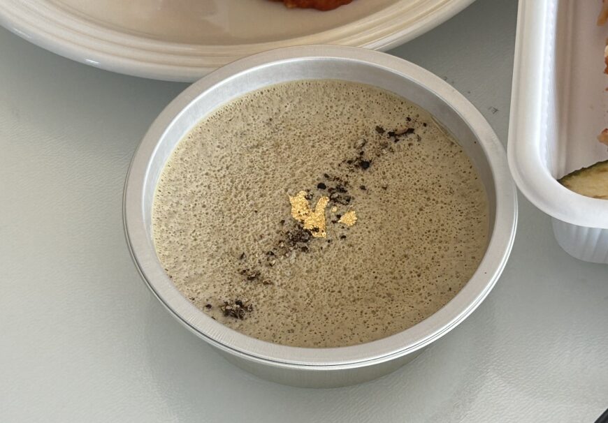 ムース状に仕立てられたふわふわの鶏レバーは、香り高く、臭みがまったくありません。金箔とブラックペッパーがおしゃれにトッピングされており、バケットとの相性も抜群!