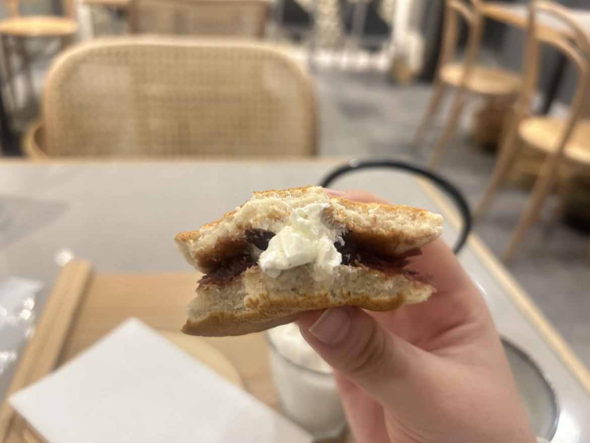 私が選んだのは塩バター味。ぱかっと開けてみると、中にはぎっしりあんこが詰まっており、真ん中には軽くて滑らかな「クレームオブール」(バタークリーム)が入っています。