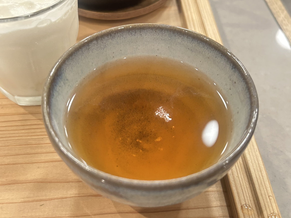 温かみのある木のお盆で運ばれてきたセットの湯呑みに注ぐと、ふわっと香ばしいほうじ茶の香りが!
