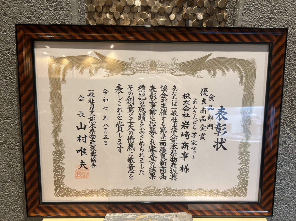 なんと、令和7年8月には、熊本県物産振興協会が主催する「第31回優良新商品表彰事業」食品部門にて、MARUIWAの「あんさんどら芋栗セット」が優良商品〈グランプリ金賞〉を受賞しているんです!その美味しさとこだわりは、お墨付きですね。