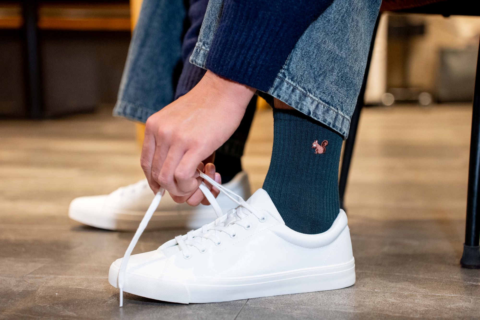 そして実は、足元にはさりげなく「リスの刺繍」が入った靴下を合わせています。