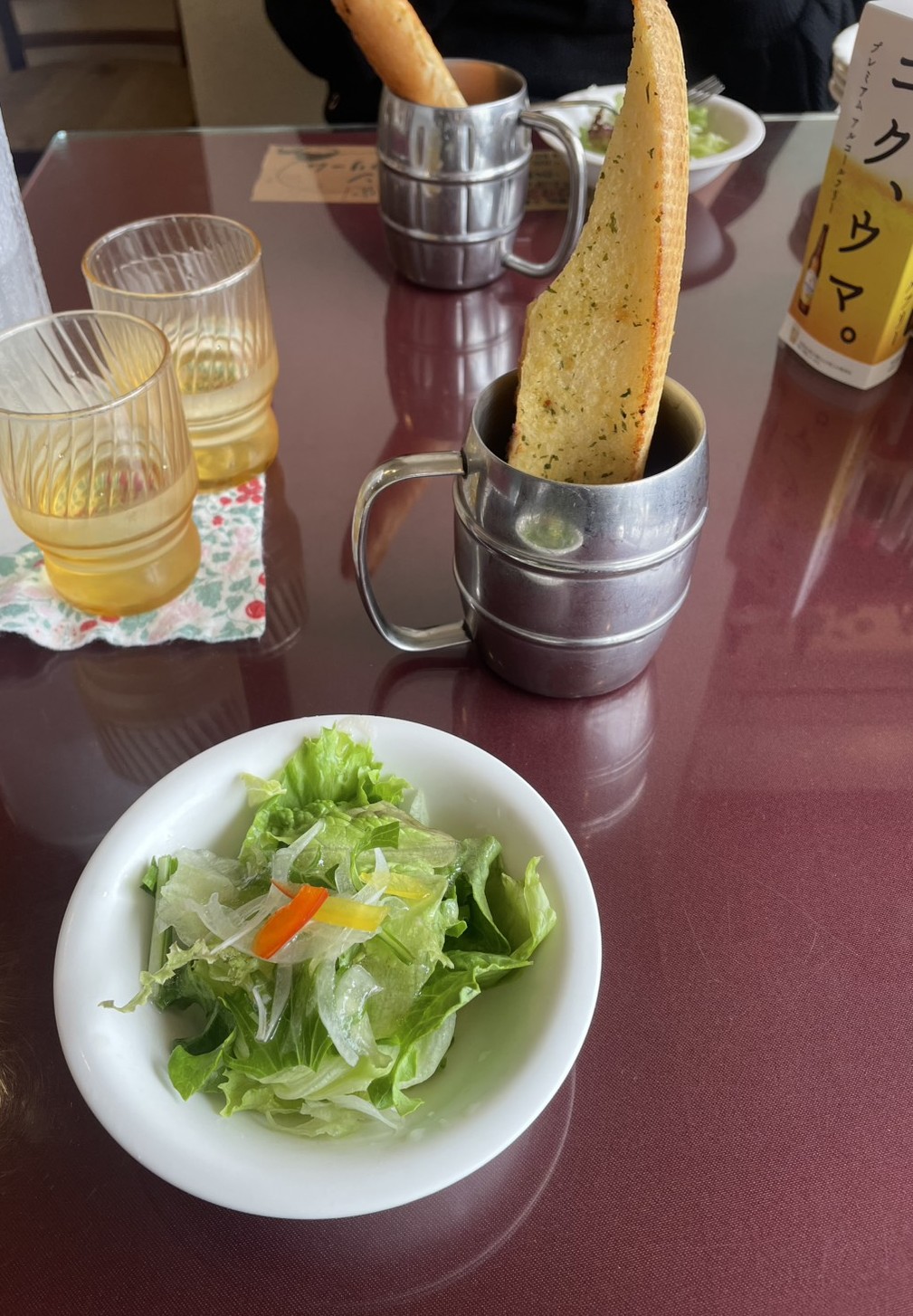 まずはサラダとバケットから。バケットは4種類から選べ、今回はガーリックを選択。ふわふわ&温かく、ガーリックの香りが食欲を一気に引き上げてくれます